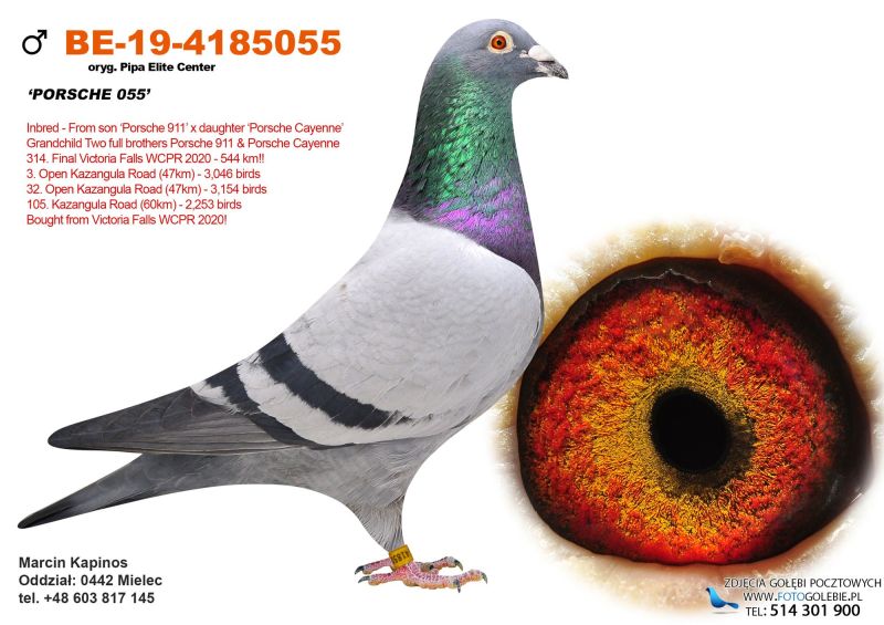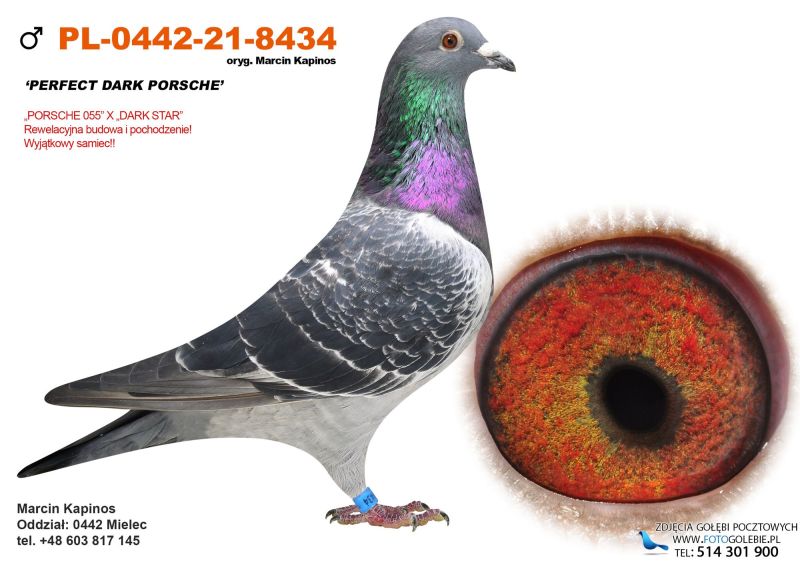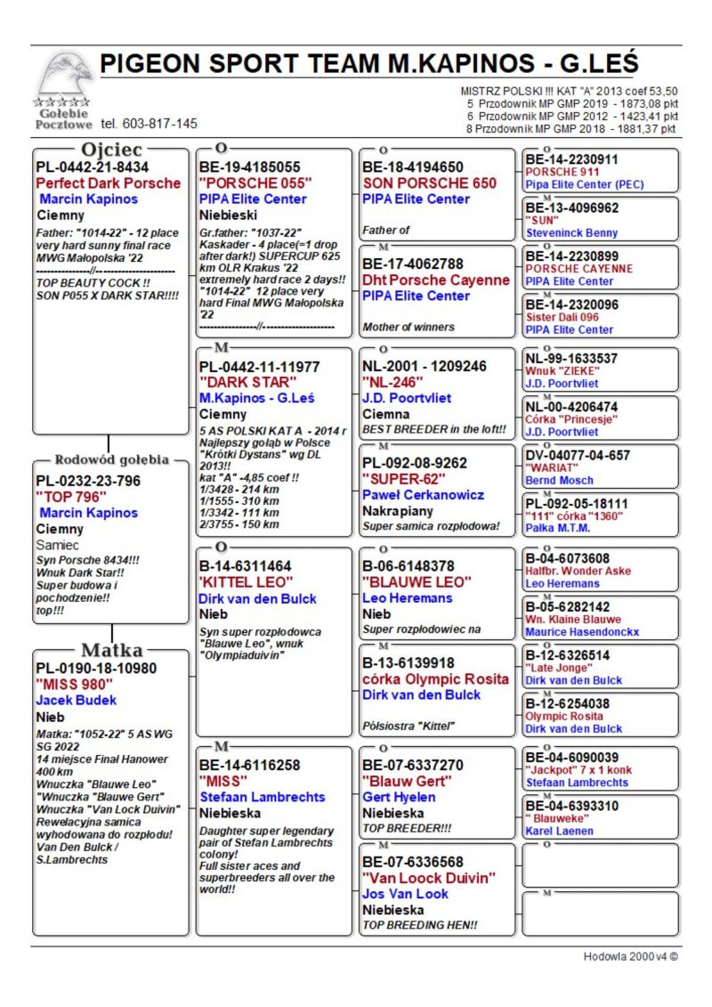 Samczyk bardzo ładnie zbudowany. Wydał kilka dobrych lotników, w zeszłym sezonie córka w lotach gołębi młodych zdobyła 5 konk. na 5 wkładań. Ojciec syn "Porsche 055" i "Dark Star", matka z gołębi sprinterskich.