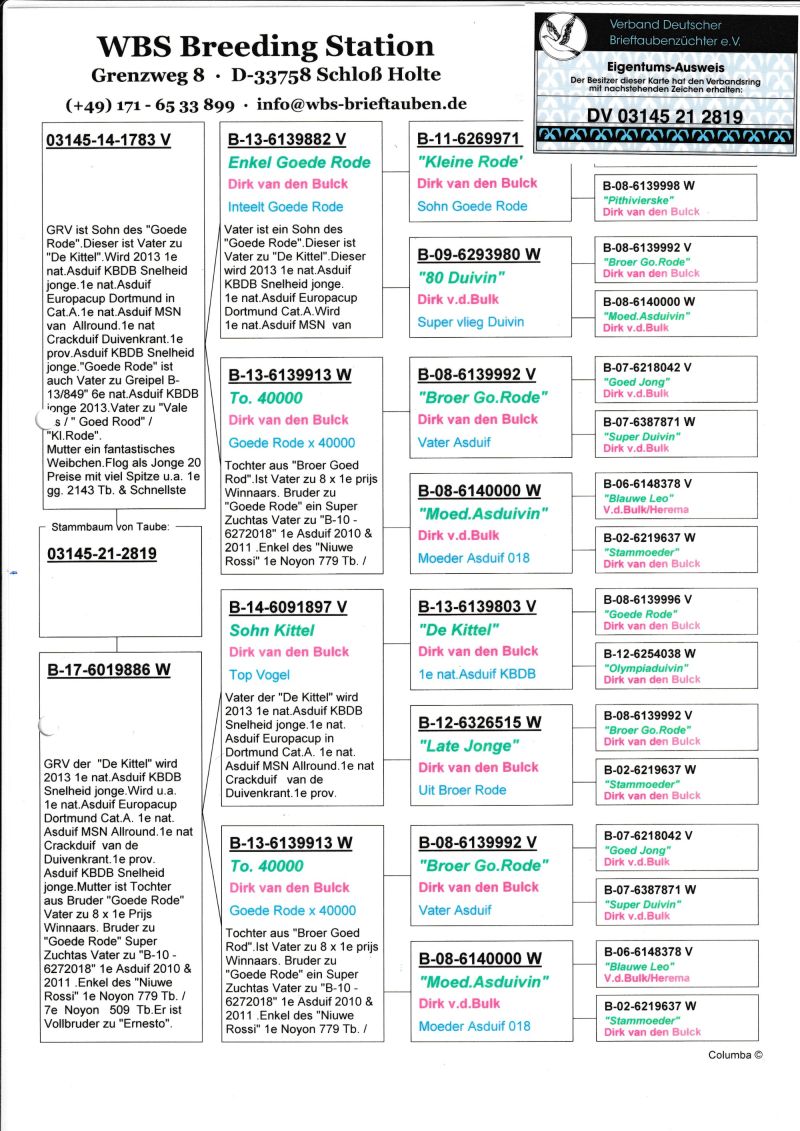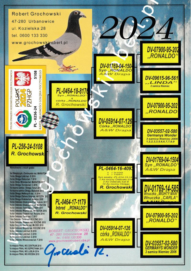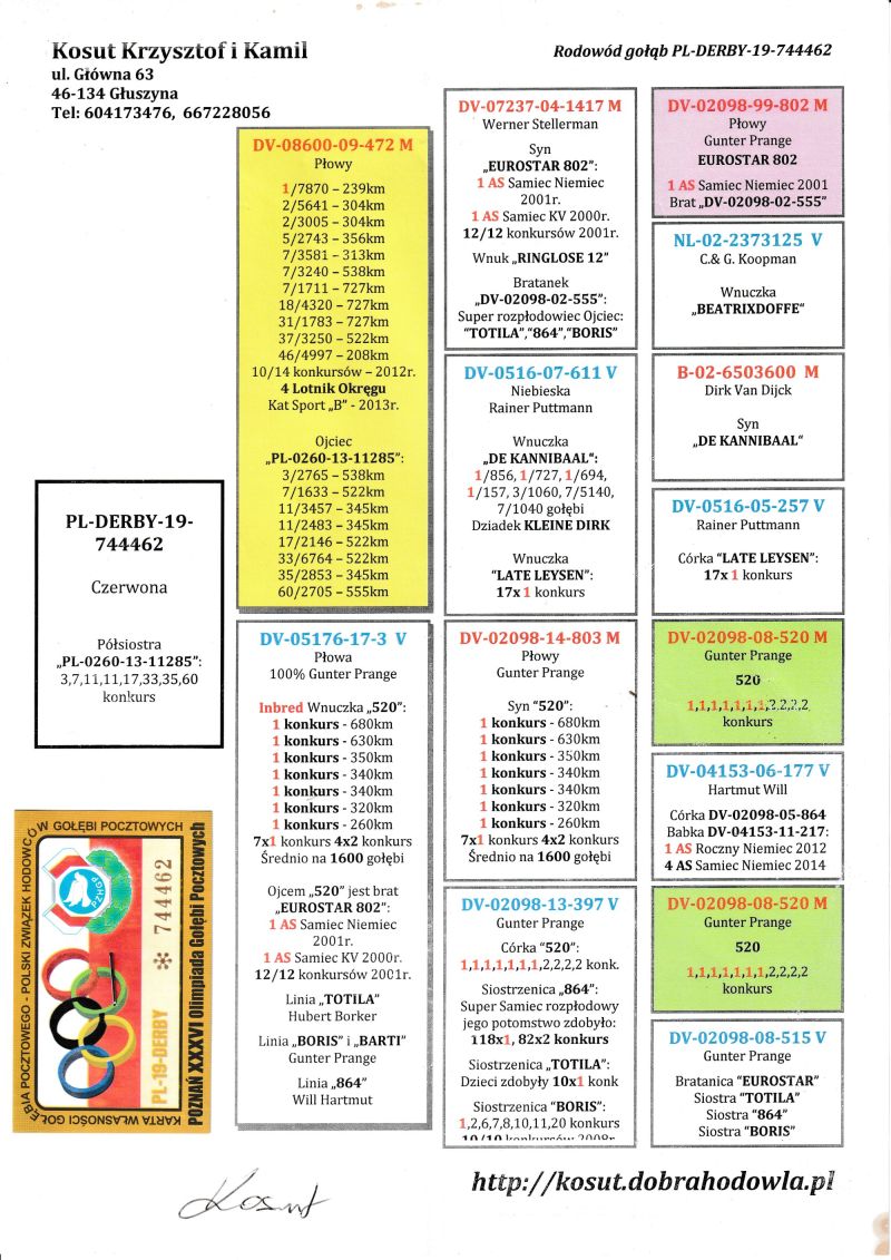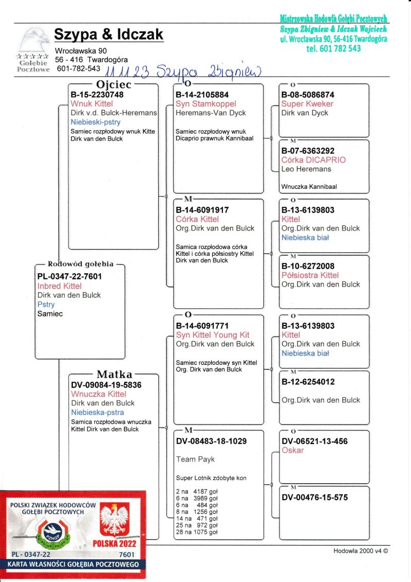 W związku z brakiem odebrania zamówionych gołębi oraz brakiem miejsca sprzedam 48szt. gołębi z lipca-września. Gołębie zaszczepione szczepionką "Salmovir". Rodzeństwo tych gołębi wylatało w sezonie 2025r. 2,3 miejsce. Gołębie nie będą sprzedawane pojedynczo. Załatwienie transportu leży po stronie kupującego. Poniżej zdjęcia rodowodów rodziców.