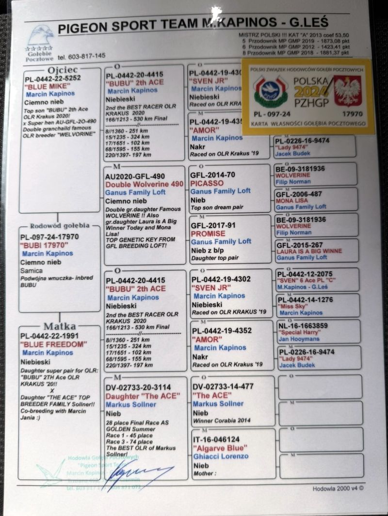 Oryginalny gołąb z hodowli Kapinos-Leś. Podwójna wnuczka Bubu. Młody po oferowanej samicy 4konk szpicowe. Szczegóły pochodzenia w rodowodzie. Więcej informacji pod nr tel.: 880 880 503