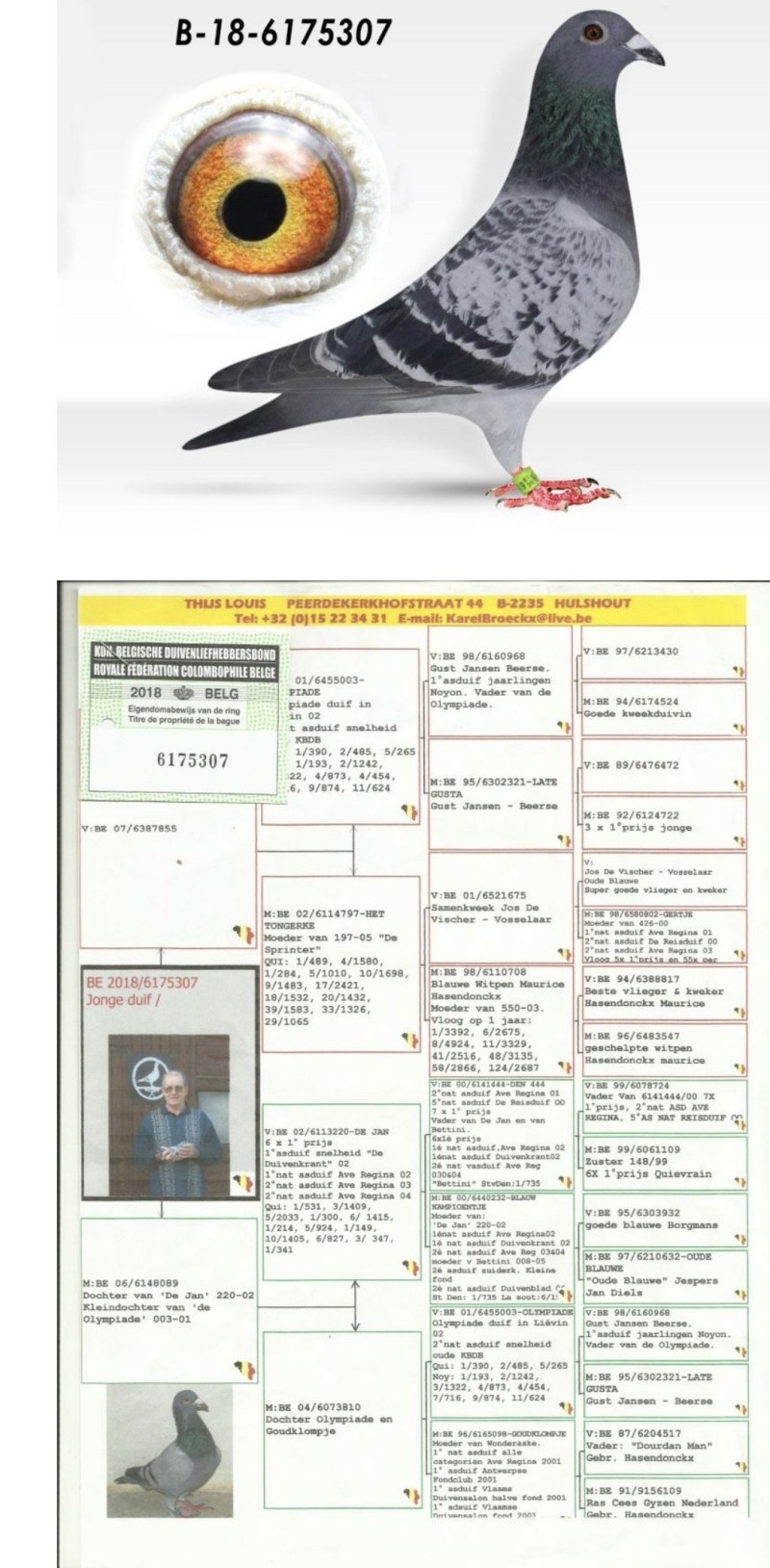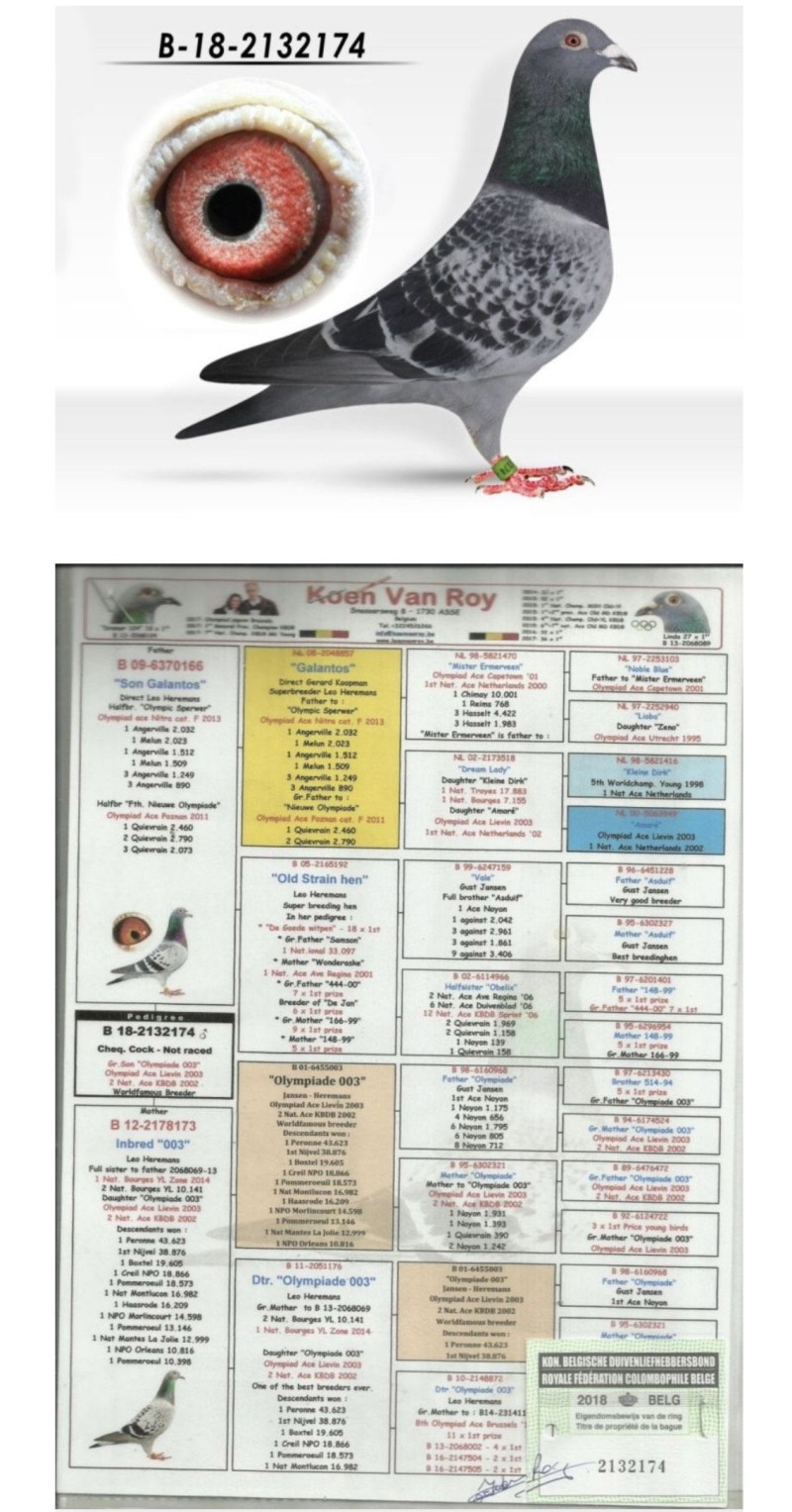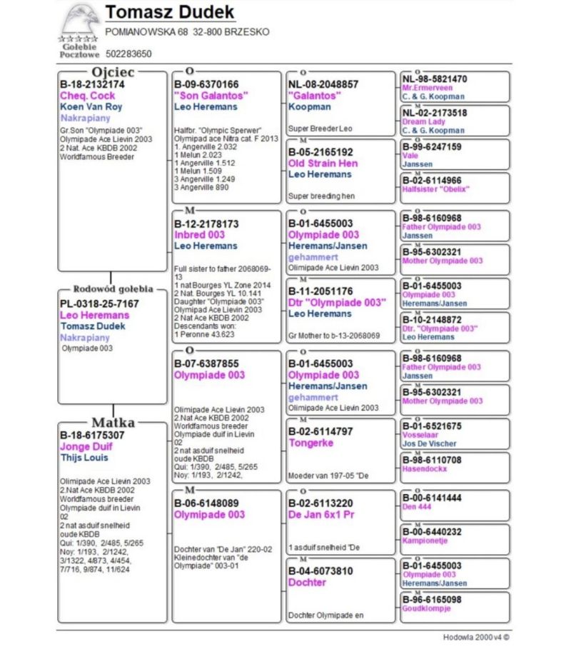 Oryginalny gołąb z hodowli Tomasza Dudka. Inbred Olympiade 003 Leo Heremans 4x 003 Szczegóły pochodzenia w rodowodzie. Więcej informacji pod nr tel.: 880 880 503 *Do gołębia będzie dołączony certyfikat DNA niewidoczny na zdjęciu