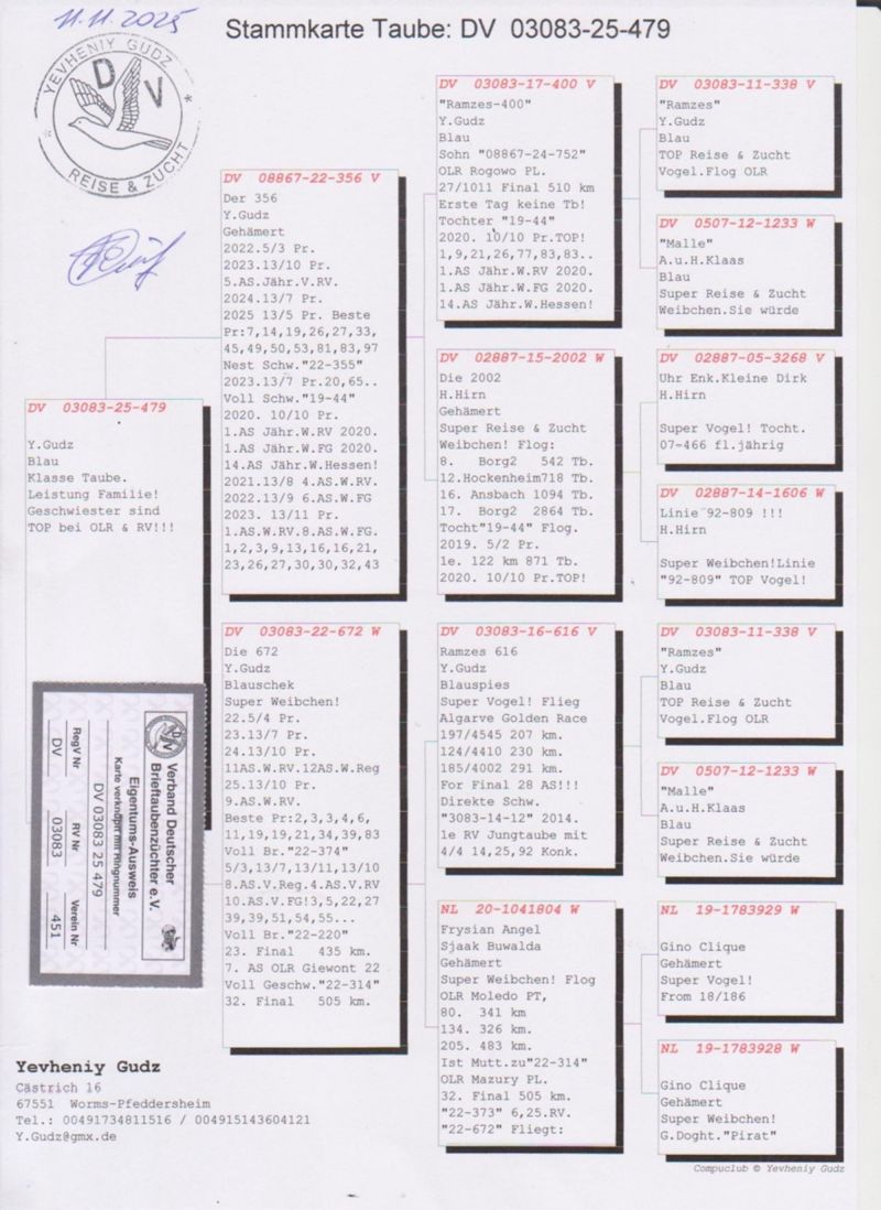 Oryginalny gołąb z Hodowli Yevheniy Gudz. Więcej informacji w rodowodzie oraz pod telefonem: 004915143604121 tez WhatsApp (Hodowca mówi po Polsku). Wysylka odbedzie sie z Polski(lub odbiór u Kolegi Bochenczaka na WG Giewont), koszt wysylki od 130zl, bedzie ustalona indywidualnie...Prosze licytowac w 100% pewnosci zakupu!!!