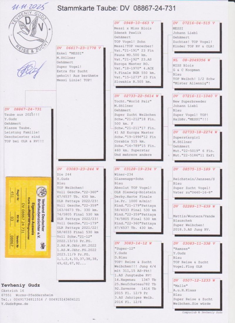 DV-08867-24(25)-731 Oryg.Y.Gudz. M.Sölner (MESSI) x Super Samica Siostra 2x1 oraz OLR Pattaya top wyniki!!!