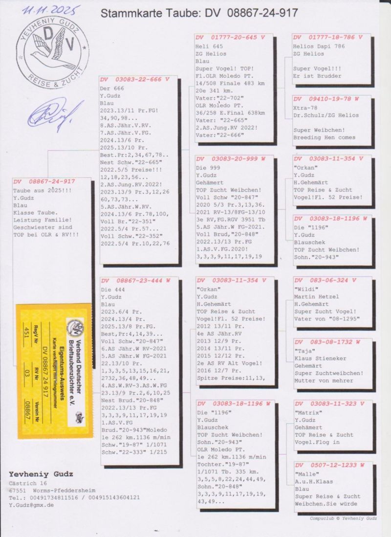Oryginalny gołąb z Hodowli Yevheniy Gudz. Więcej informacji w rodowodzie oraz pod telefonem: 004915143604121 tez WhatsApp (Hodowca mówi po Polsku). Wysylka odbedzie sie z Polski(lub odbiór u Kolegi Bochenczaka na WG Giewont), koszt wysylki od 130zl, bedzie ustalona indywidualnie...Prosze licytowac w 100% pewnosci zakupu!!!