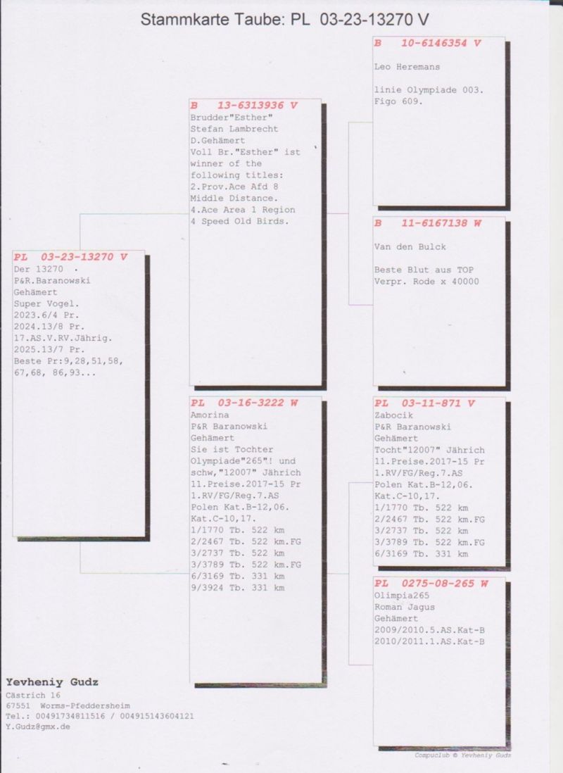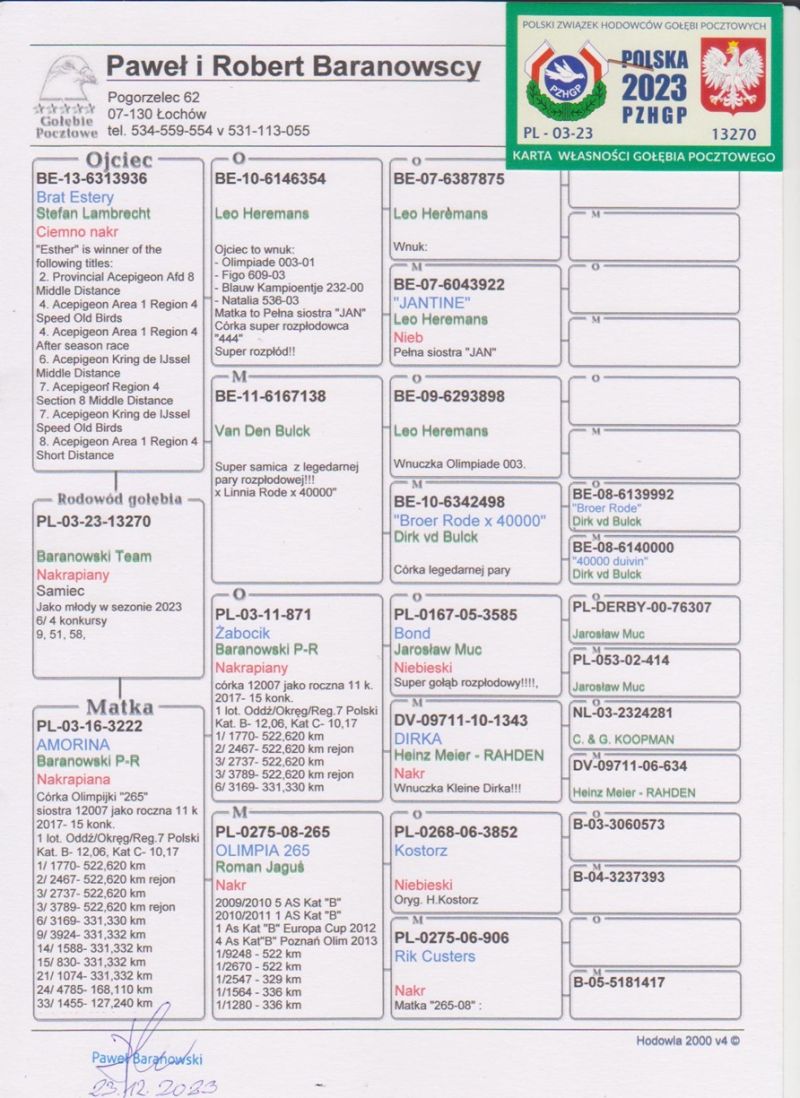 Oryginalny gołąb z Hodowli P&R Baranowski. Więcej informacji w rodowodzie oraz pod telefonem: 004915143604121 tez WhatsApp (Hodowca mówi po Polsku). Wysylka odbedzie sie z Polski(lub odbiór u Kolegi Bochenczaka na WG Giewont), koszt wysylki od 130zl, bedzie ustalona indywidualnie...Prosze licytowac w 100% pewnosci zakupu!!!