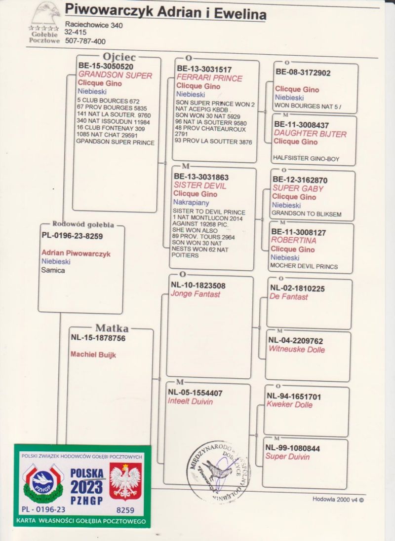 PL-0196-23-8259 Oryg. A i E Piwowarczyk. Lotowana po Gino Clicque x M.Buijk. ma 7.Kk.na dystansie 500+km
