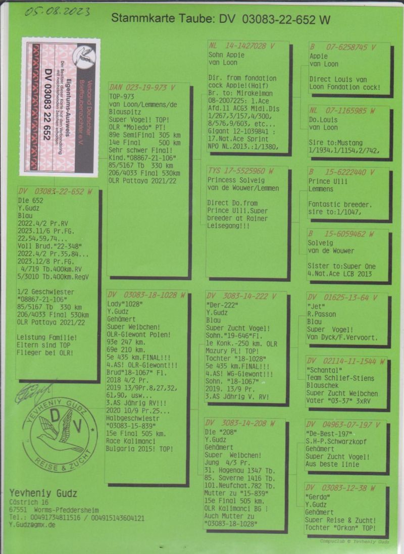 Oryginalny gołąb z Hodowli Yevheniy Gudz. Więcej informacji w rodowodzie oraz pod telefonem: 004915143604121 tez WhatsApp (Hodowca mówi po Polsku). Wysylka odbedzie sie z Polski(lub odbiór u Kolegi Bochenczaka na WG Giewont), koszt wysylki od 130zl, bedzie ustalona indywidualnie...Prosze licytowac w 100% pewnosci zakupu!!!