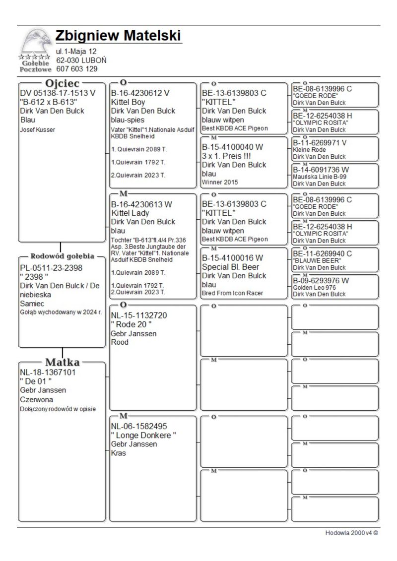 PL-0511-23-2398 TOP !!! O. Podwójny Wnuk „Kittel“ M. Janssen Piet Manders Vos Voliere v.97 – Inbred Jonge Merkx Van