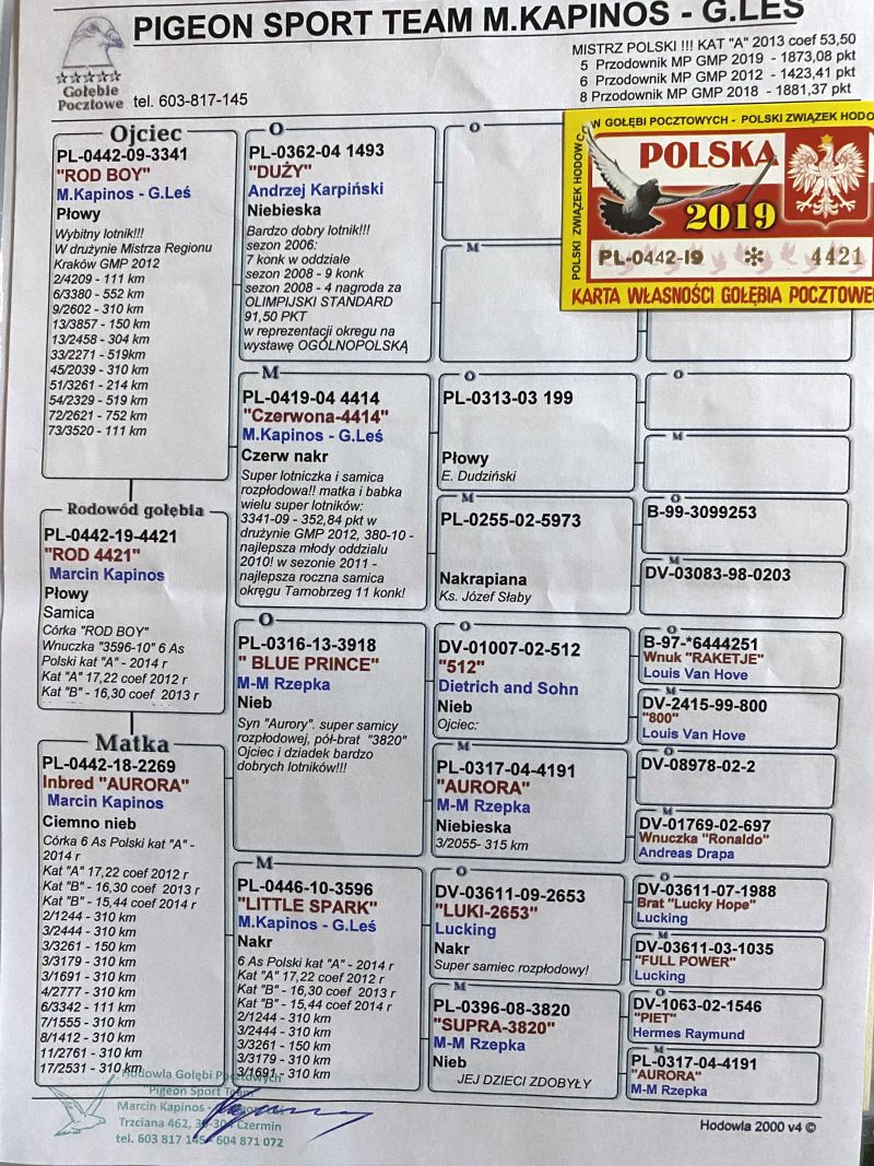Oryginalny gołąb z hodowli Kapinos-Leś. Szczegóły pochodzenia w rodowodzie. Samica super budowy, odrobaczona, zaszczepiona, przygotowana do lęgów. Odbiór osobisty lub wysyłka kurierem (165-200zł).Więcej informacji pod nr tel.: 575 962 212