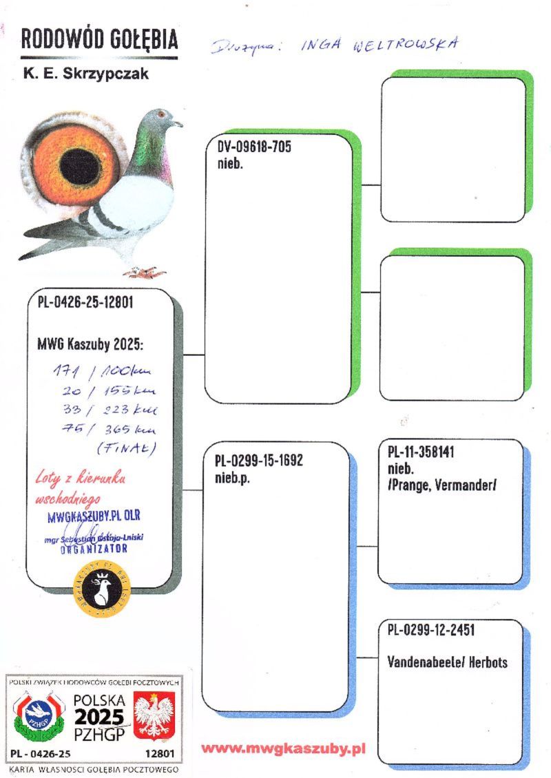 Gołąb (75 MIEJSCE z lotu Finałowego) brał udział w zawodach na Wspólnym Gołębniku KASZUBY. Więcej informacji w rodowodzie i załącznikach. Kontakt do Właściciela Gołębnika tel.601686344 (Sebastian Ostoja-Lniski). Informujemy poza tym, że rozpoczęły się zapisy na sezon 2026. Serdecznie zapraszam do rywalizacji..... Uwaga! Koszty związane z transportem pokrywa nabywca gołębia. W zależności od kuriera wynoszą one około 150zł. Można również odebrać gołębia osobiście lub we własnym zakresie zorganizować kuriera. Powyżej sylwetki gołębia znajduje się video z jego prezentacją.