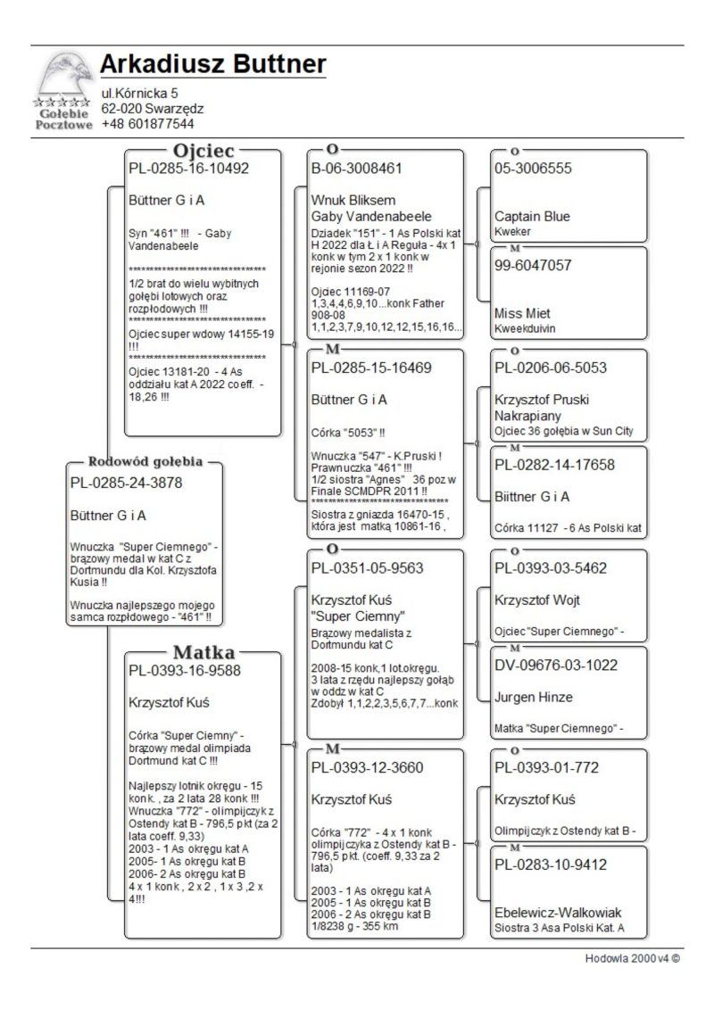 Piękny samczyk wnuk dwóch wybitnych samców - 9563 - brązowy medalista w kat C z Dortmundu dla Kol K.Kusia oraz 461 - jednego z najlepszych rozpłodowców w Polsce ! "461" najważniejsze referencje z 2025/2026 roku: Prawnuk 5110- Kolegi Jacka Orszulika 2 As Polski kat A - kandydat na Olimpiadę 2026 w Dortmundzie !!! z 2024 roku: 1 As Rejonu z 8 lotów rejonowych - prawnuczka 461 u Kol Adama Gasperowicza, prawnuk "461" wygrał finał na WG Podhale wygrywając 50 000 dla Kolegi Bogdana Bieli !- liczba jedynek jego wnuków , prawnuków i oczywiście dzieci będzie około stu a kilkadziesiąt gołębi z 461 zajmowało top 10 w kat As w różnych kategoriach w różnych okręgach w Polsce- tylko w 2022 roku w 9 różnych oddziałach przeważnie prawnuki zdobywały 1 lokatę w oddz !!! Jego wnuczka została też na olimpiadzie w tym roku 4 gołębiem świata w kat H dla Kol Łukasza Reguły. !! Na screenie przykład jak potrafią siadać gołębie w oddz z linii 461 ... 3-prawnuk,4 -wnuk , 5-wnuk , 6 - roczna wnuczka - kat A 9 z groszem ma , 7 wnuk , 11 - wnuk oraz 15 - wnuk 461. oraz kolejny lot z 2020 roku : 1,2,3,5,7,8 wnuk oraz 15 prawnuk ? do tego roczna samiczka Kolegów Piotra I Marcina Żureckich z Kępna została 6 asem Polski w kat G ...tak leciała... 2 na 5200 g ze 174 km 8 na 4573 z 219 km 8 na 3583 g z 324 km 8 na 1764 g z 324 g 21 na 4535 g z 549 km - rej - coeff jak widać na zdjęciu 13,54 miała też szósty super lot była 25 na 4984 g coeff 5,02 1 goląb z Extra finału na WG Giewont 2022 dla Teamu Chudy-Molek to też linia "461" ojciec to syn mojej super wdowy 2161-12 ,, Dwie Prawnuczki .... u Kol Kazimierza Goździejewskiego ( jedna w kat M w 2023 roku miała coeff 4,84 ( 1 as okręgu Wałbrzych a druga w 2024 roku 2,58 - 2 x 1 na oddział (2 as Polski kat M w/g miesięcznika "Hodowca") - w kat "I" - coeff 9 z haczykiem), "461" to też pradziadek PL-0122-22-2219 - w 2 sezony na 21 wkładań 20 konkursów - kat A coeff 9,08 a z dwóch lat do wystaw kat A-74,86 , kat B-65,94 a kat D-72,20 W 2023 roku zdobył 1 konk na ok 4100 gołębi z miejsc Sulechów a w 2024 roku 2 x 2 konk w oddz !!! oraz pradziadek PL-0122-22-5510 w kat A w 2024 roku uzyskał coeff. 4,75 Zdobył też 1 konk na oddz z miejsc. Brzeg Dolny na 4322 gołębie !! Został też 4 Asem Polski kat krótki dystans 2024 z coeff 17 z groszem z 5 lotów do kat A właśnie dla Kolegi Jacka Orszulika !!! oraz wiele,wiele innych.....od 2017 roku 30x mistrzostwo oddz w różnych kategoriach w tym 2019-2021 3 x z rzędu supermistrzostwo oddziału Poznań, więcej info 601 877 544
