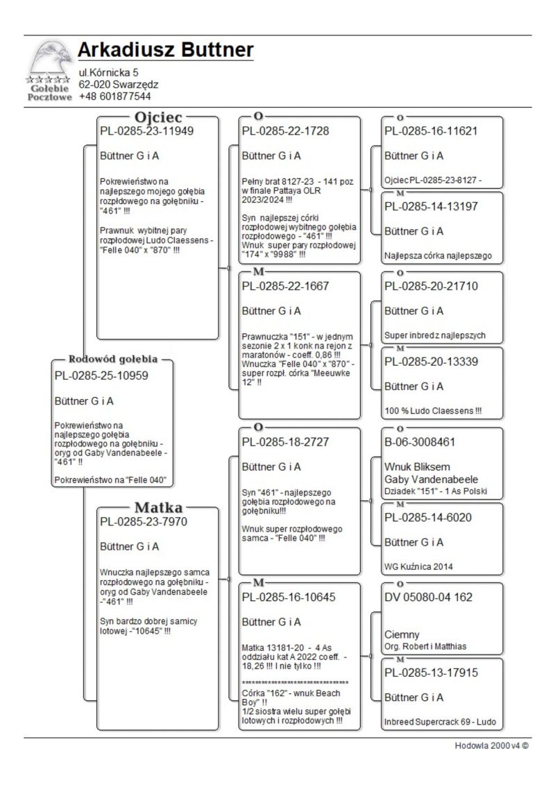 Extra młody pokrewieństwo na mojego najlepszego gołębia rozpłodowego na gołębniku - jednego z najlepszych rozpłodowców Polski - "461"(oryg Gaby Vandenabeele - wnuk "Bliksem"). Pokrewieństwo na innego super rozpłodowego samca - oryg od Ludo Claessens - "Felle 040"! "791" - ojciec "ZigZag McQueen" - 117 poz w finale SAMDPR , ojciec "Lotniskowej" , najlepszej samicy rozpłodowej u Kol Krzyśka Kusia oraz dziadek 8755 - rezerwa na olimpiadę w kat olimpijskiej maraton . Jest też pradziadkiem PL-0122-22-2219 - w 2 sezony na 21 wkładań 20 konkursów - kat A coeff 9,08 a z dwóch lat do wystaw kat A-74,86 , kat B-65,94 a kat D-72,20 W 2023 roku zdobył 1 konk na ok 4100 gołębi z miejsc Sulechów a w 2024 roku 2 x 2 konk w oddz !!! oraz PL-0122-22-5110 w kat A w 2024 roku uzyskał coeff. 4,75 Zdobył też 1 konk na oddz z miejsc. Brzeg Dolny na 4322 gołębie !! Został też 4 Asem Polski kat krótki dystans 2024 z coeff 17 z groszem z 5 lotów do kat A właśnie dla Kolegi Jacka Orszulika !!!oraz ojciec , dziadek i pradziadek wielu wybitnych gołębi rozpłodowych i lotowych na wielu gołębnikach !! "Felle 040" ojciec m.in 8755 , który dla Kol . Krzyśka Kusia wylatał 4 wynik w Polsce w kat olimpijskie E i był gołębiem rezerwowym na olimpiadę. Jest też pradziadkiem PL-0122-22-2219 - w 2 sezony na 21 wkładań 20 konkursów - kat A coeff 9,08 a z dwóch lat do wystaw kat A-74,86 , kat B-65,94 a kat D-72,20 W 2023 roku zdobył 1 konk na ok 4100 gołębi z miejsc Sulechów a w 2024 roku 2 x 2 konk w oddz !!! oraz PL-0122-22-5510 w kat A w 2024 roku uzyskał coeff. 4,75 Zdobył też 1 konk na oddz z miejsc. Brzeg Dolny na 4322 gołębie !! Został też 4 Asem Polski kat krótki dystans 2024 z coeff 17 z groszem z 5 lotów do kat A właśnie oraz także pradziadkiem PL-0122-21-2246 - na 16 wkładań 16 konkursów i w 2024 roku uzyskał kat A - 10,32 coeff , kat B - 8,64 coeff a z dwóch lat do wystaw kat A 53 coeff i został na ostatniej wystawie TYTUŁ 17 ASA POLSKI , w kat olimp B - 67,76 coeff a w kat D - 53,20 coeff a w 2024 roku w kat średni dystans został w/g konkursu redakcji ZOSTAŁ 9 ASEM A TAKŻE WYGRAŁ Z LOTU OKRĘGOWEGO NA 8137 GOŁĘBI Z LOTU ŚWINOUJŚCIE + 500 KM i pradziadkiem PL-0122-22-5118 uzyskał w tym 2024 roku coeff 5,24 w kat A oraz w 2023 roku 2 konk na oddział z lotu Bieganów na ok 3000 gołębi oraz 2 konkurs na oddział w 2024 rokuz miejscowości Kościan na około 4300 gołębi dla Kolegi Jacka Orszulika !!!"Felle" jest też ojcem dziadkiem wielu innych super gołębi lotowych - asów na szczeblu sekcji , oddziału i okręgu oraz gołębi ropzłodowych ! "870" - matka 14196 - 2 as oddz kat A , 8701 - ojciec 2 x 10 gołąb z finału WG Kuźnica 2015 i 2016 , i wielu wielu innych innych.Babka 1 gołębia z finału WG Podhale 2024 dla Kol. Bogdana Bieli. Babka super samca rozpłodowego u Kol Jacka Orszulika, matka "17915" - "17915" - wybitna samica rozpłodowa - babka dwóch mega lotników na PLGP u Kol Krzysztofa Mrowieca oraz babka 2 super samic Lotowych u Kol Kazimierza Goździejewskiego ( jedna w kat M w 2023 roku miała coeff 4,84 a druga w 2024 roku 2,58 - 2 x 1 na oddział - w kat "I" - coeff 9 z haczykiem) "461" najważniejsze referencje z 2025/2026 roku: Prawnuk 5110- Kolegi Jacka Orszulika 2 As Polski kat A - kandydat na Olimpiadę 2026 w Dortmundzie !!!. z 2024 roku: 1 As Rejonu z 8 lotów rejonowych - prawnuczka 461 u Kol Adama Gasperowicza, prawnuk "461" wygrał finał na WG Podhale wygrywając 50 000 dla Kolegi Bogdana Bieli !- liczba jedynek jego wnuków , prawnuków i oczywiście dzieci będzie około stu a kilkadziesiąt gołębi z 461 zajmowało top 10 w kat As w różnych kategoriach w różnych okręgach w Polsce- tylko w 2022 roku w 9 różnych oddziałach przeważnie prawnuki zdobywały 1 lokatę w oddz !!! Jego wnuczka została też na olimpiadzie w tym roku 4 gołębiem świata w kat H dla Kol Łukasza Reguły. !! Na screenie przykład jak potrafią siadać gołębie w oddz z linii 461 ... 3-prawnuk,4 -wnuk , 5-wnuk , 6 - roczna wnuczka - kat A 9 z groszem ma , 7 wnuk , 11 - wnuk oraz 15 - wnuk 461. oraz kolejny lot z 2020 roku : 1,2,3,5,7,8 wnuk oraz 15 prawnuk ? do tego roczna samiczka Kolegów Piotra I Marcina Żureckich z Kępna została 6 asem Polski w kat G ...tak leciała... 2 na 5200 g ze 174 km 8 na 4573 z 219 km 8 na 3583 g z 324 km 8 na 1764 g z 324 g 21 na 4535 g z 549 km - rej - coeff jak widać na zdjęciu 13,54 miała też szósty super lot była 25 na 4984 g coeff 5,02 1 goląb z Extra finału na WG Giewont 2022 dla Teamu Chudy-Molek to też linia "461" ojciec to syn mojej super wdowy 2161-12 ,, Dwie Prawnuczki .... u Kol Kazimierza Goździejewskiego ( jedna w kat M w 2023 roku miała coeff 4,84 ( 1 as okręgu Wałbrzych a druga w 2024 roku 2,58 - 2 x 1 na oddział (2 as Polski kat M w/g miesięcznika "Hodowca") - w kat "I" - coeff 9 z haczykiem), "461" to też pradziadek PL-0122-22-2219 - w 2 sezony na 21 wkładań 20 konkursów - kat A coeff 9,08 a z dwóch lat do wystaw kat A-74,86 , kat B-65,94 a kat D-72,20 W 2023 roku zdobył 1 konk na ok 4100 gołębi z miejsc Sulechów a w 2024 roku 2 x 2 konk w oddz !!! oraz pradziadek PL-0122-22-5510 w kat A w 2024 roku uzyskał coeff. 4,75 Zdobył też 1 konk na oddz z miejsc. Brzeg Dolny na 4322 gołębie !! Został też 4 Asem Polski kat krótki dystans 2024 z coeff 17 z groszem z 5 lotów do kat A właśnie dla Kolegi Jacka Orszulika !!! oraz wiele,wiele innych.....od 2017 roku 30x mistrzostwo oddz w różnych kategoriach w tym 2019-2021 3 x z rzędu supermistrzostwo oddziału Poznań, więcej info 601 877 544
