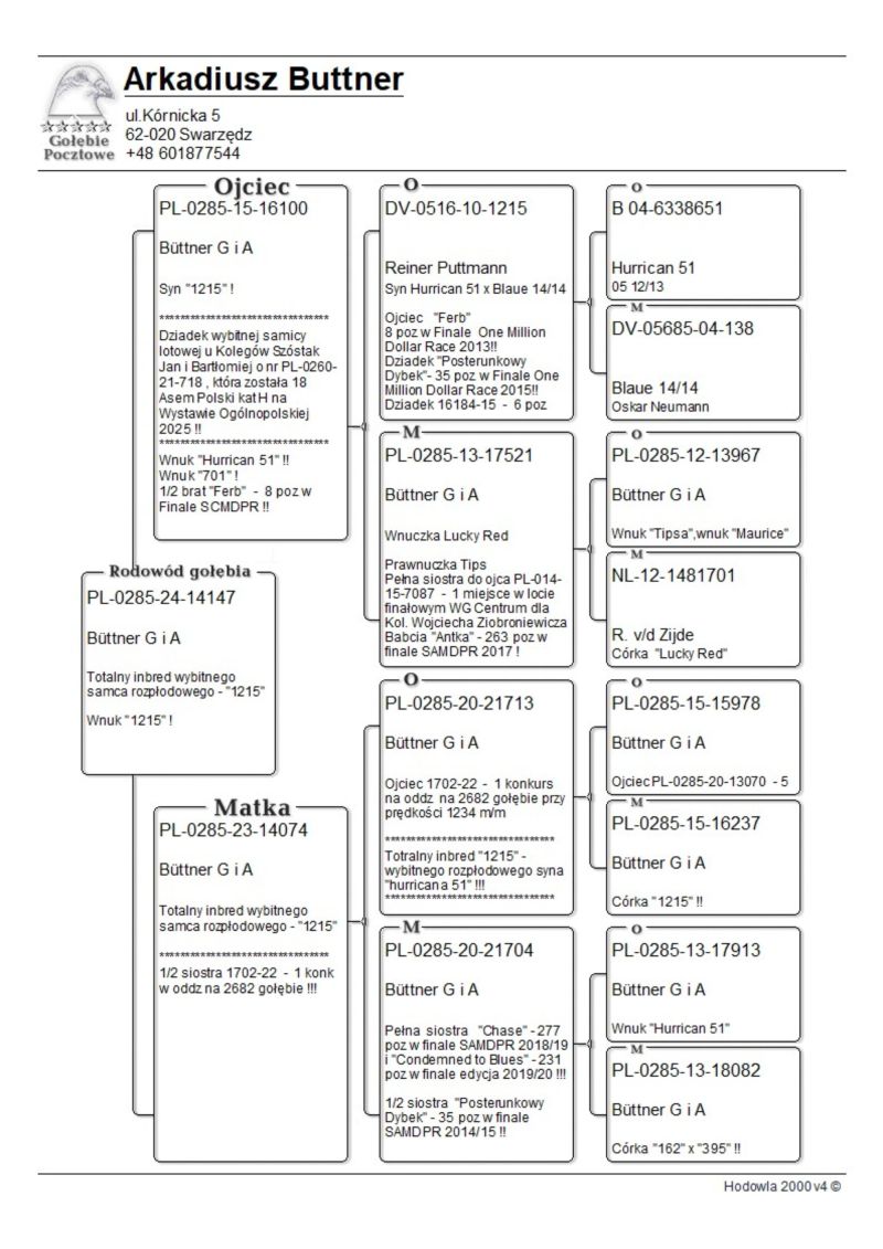 Extra samczyk - syn 16100 super samca rozpłodowego - syna 1215. Matka samczyka to inbredka na 17913 - najlepszego mojego samca rozpłodowego jeżeli chodzi o WG - a tym samym na "1215" - najlepszego syna "Hurricana 51" w Polsce !! "17913" (syn 1215)- najlepszy mój samiec rozpłodowy jeżeli chodzi o WG i nie tylko samiczka 6334-14 najlepiej punktowała mi do GMP 2017 kiedy udało się zdobyć XII miejsce w Polsce. Samiczka jest też właśnie wnuczką 1215 , z którego wywodzą się z ....8,25(dla Kol.Chłopeckiego) , 35 , 130 ,231 , 263 , 277 , 278 gołąb w finale SAMDPR w RPA wywodził się z 1215 ...szczególnie ta czołówka wydaje mi się , że jest imponująca ...nie wiele jest takich linii , które potrafią takie coś zrobić... po bracie 17913 - 15978 był też w 2020 roku 5 gołąb w finale WG Krakus . "2644" (podwójna wnuczka "17913") - babka 2 super samic Lotowych u Kol Kazimierza Goździejewskiego ( jedna w kat M w 2023 roku miała coeff 4,84 a druga w 2024 roku 2,58 - 2 x 1 na oddział - w kat "I" - coeff 9 z haczykiem) 2 As Polski w Maratonie 2024 oraz 12 As świata .od 2017 roku 30x mistrzostwo oddz w różnych kategoriach w tym 2019-2021 3 x z rzędu supermistrzostwo oddziału Poznań, więcej info 601 877 544 youtube.com/watch?v=PnrNZw6FUk4 youtube.com/watch?v=n8IiJ8wn6-E youtube.com/watch?v=b2Rnw7tSU6U youtube.com/watch?v=b2Rnw7tSU6U&t=1s