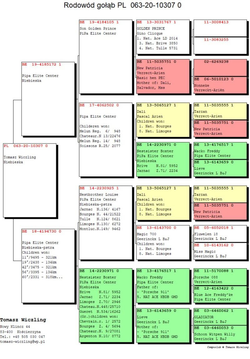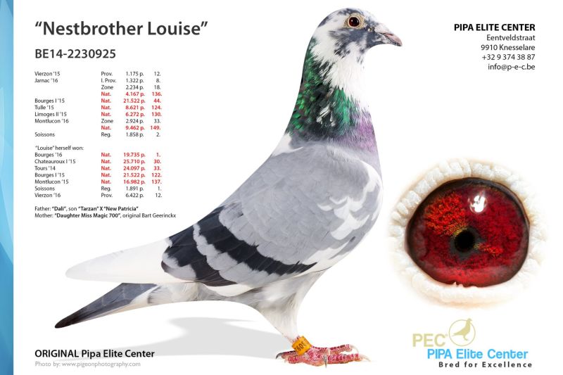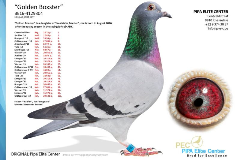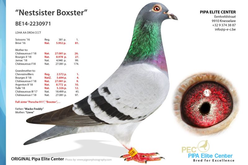 Samiczka pięknie zbudowana 100% PIPA Elite Center, inbred Nestsister Boxter. Półsiostra pierwszego rocznego samca oddziału 3 lotnika okręgu kat. C. Wydała kilka bardzo dobrych lotników syn "8711" jako dwuletni 11 konk. na 12 wkładań.