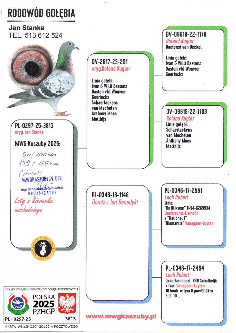 Gołąb brał udział w zawodach na Wspólnym Gołębniku KASZUBY. Więcej informacji w rodowodzie i załącznikach. Kontakt do Właściciela Gołębnika tel.601686344 (Sebastian Ostoja-Lniski). Informujemy poza tym, że rozpoczęły się zapisy na sezon 2026. Serdecznie zapraszam do rywalizacji..... Uwaga! Koszty związane z transportem pokrywa nabywca gołębia. W zależności od kuriera wynoszą one około 150zł. Można również odebrać gołębia osobiście lub we własnym zakresie zorganizować kuriera. Powyżej sylwetki gołębia znajduje się video z jego prezentacją.