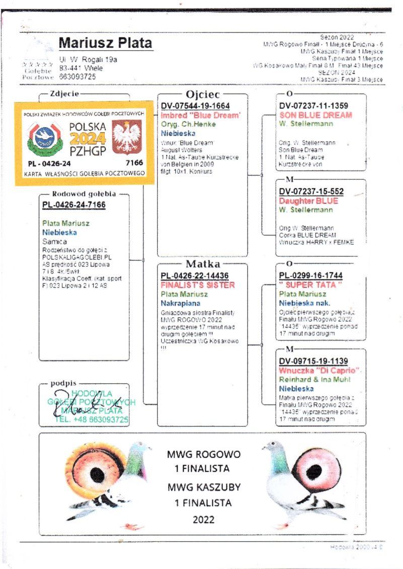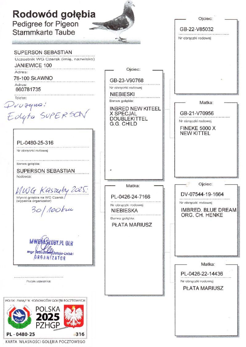 Gołąb brał udział w zawodach na Wspólnym Gołębniku KASZUBY. Więcej informacji w rodowodzie i załącznikach. Kontakt do Właściciela Gołębnika tel.601686344 (Sebastian Ostoja-Lniski). Informujemy poza tym, że rozpoczęły się zapisy na sezon 2026. Serdecznie zapraszam do rywalizacji..... Uwaga! Koszty związane z transportem pokrywa nabywca gołębia. W zależności od kuriera wynoszą one około 150zł. Można również odebrać gołębia osobiście. Powyżej sylwetki gołębia znajduje się video z jego prezentacją.