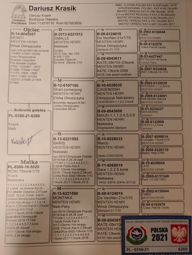 PL-0350-21-6260 Oryg. Dariusz Krasik Syn 2 Lotnika na Świecie Kat. B - FCI 2,07 coef 100% Menten Henri