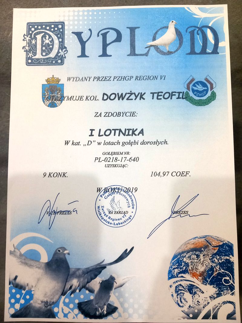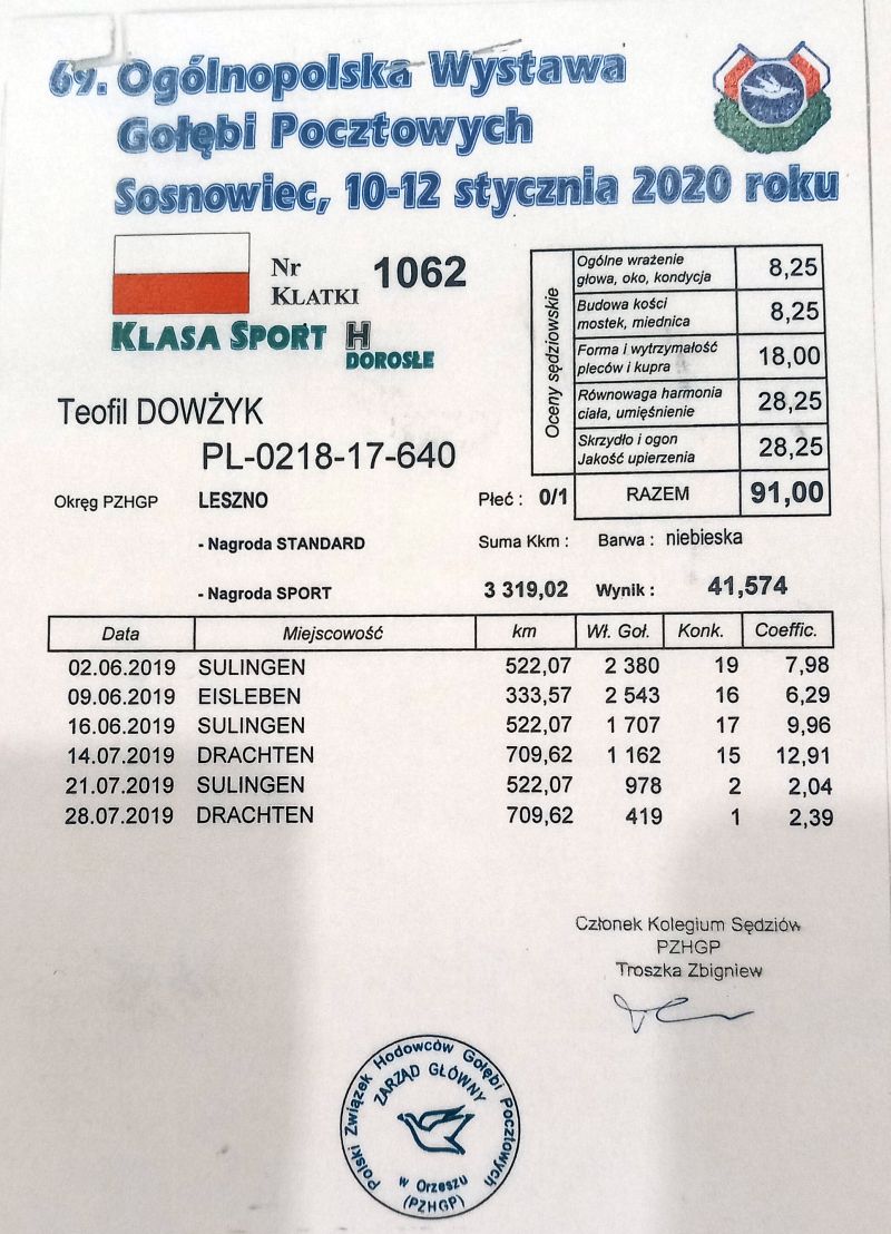Oryginalny gołąb z hodowli Teofil Dowżyk. Szczegóły pochodzenia w rodowodzie. Więcej informacji pod nr tel.: 600 628 026