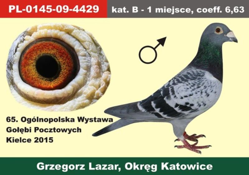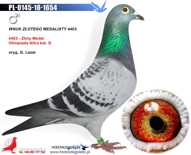Oryginalny gołąb z hodowli Grzegorza Lazara . Szczegóły pochodzenia w rodowodzie. Koszt transportu 150 zł. Gołąb zaszczepiony , przygotowany do kolejnego sezonu rozpłodowego.