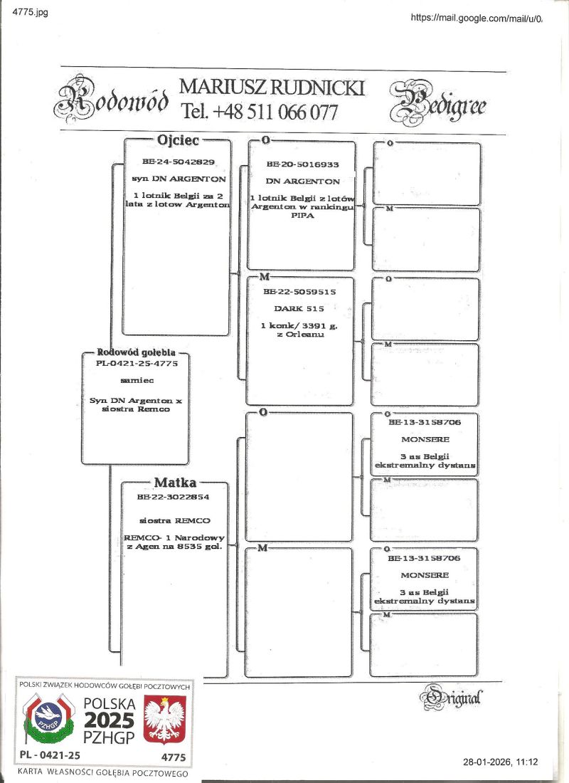 Matka to siostra Remco. REMCO wygrał jeden z najcięższych lotów narodowych ostatnich lat w Belgii w temperaturze ponad 30 stopni i z jednodniowym opóźnieniem ze startem ze względu na mgłę. Odbił się o świcie następnego dnia o godz. 04:24 i był pierwszym gołębiem Belgii na 8535 gołębi z lotu Agen. REMCO to podwójny wnuk MONSERE, który był 3 lotnikiem Belgii na ekstremalnym dystansie. W rodowodzie linia NEW LAUREAAT. Ojciec syn DN ARGENTON- 1 lotnik Belgii z lotów Argenton. Szczegóły pochodzenia w rodowodzie i pod nr tel. 696 241 555
