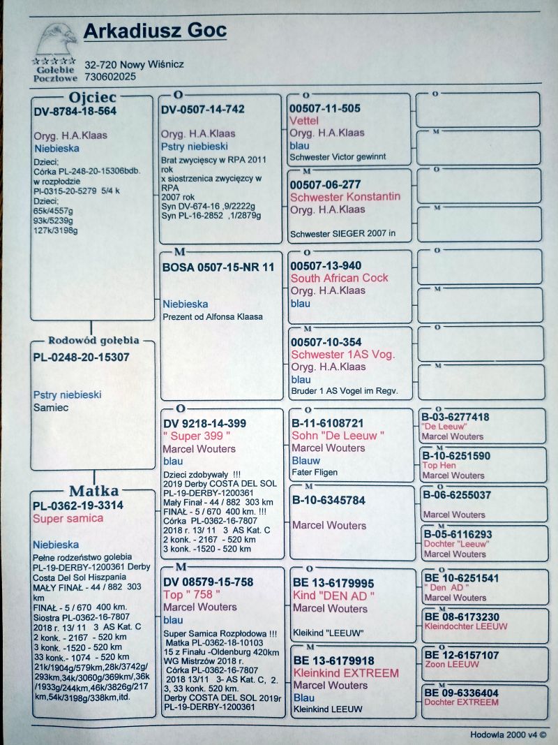 Oryginalny gołąb z hodowli Arkadiusza Goc. Szczegóły pochodzenia w rodowodzie. Więcej informacji pod nr tel.: 730602025 **Odbiór osobisty lub po uzgodnieniu transportu. Gołębie młode 2021rok 2 przodownik 7z 50, 1 przodownik 10z całości,24 przodownik okręgu Kraków, 2022rok 2 przodownik 7z 50, Vice Mistrz 10 z całości, 2023 rok 2 przodownik 10 z całości, 2 przodownik 10 z 50