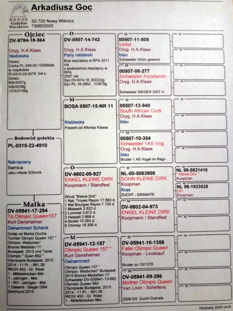 Oryginalny gołąb z hodowli Arkadiusz Goc. Szczegóły pochodzenia w rodowodzie. Więcej informacji pod nr tel.: 730602025 **Odbiór osobisty lub po uzgodnieniu transportu. Gołębie młode 2021rok 2 przodownik 7z 50, 1 przodownik 10z całości,24 przodownik okręgu Kraków, 2022rok 2 przodownik 7z 50, Vice Mistrz 10 z całości, 2023 rok 2 przodownik 10 z całości, 2 przodownik 10 z 50
