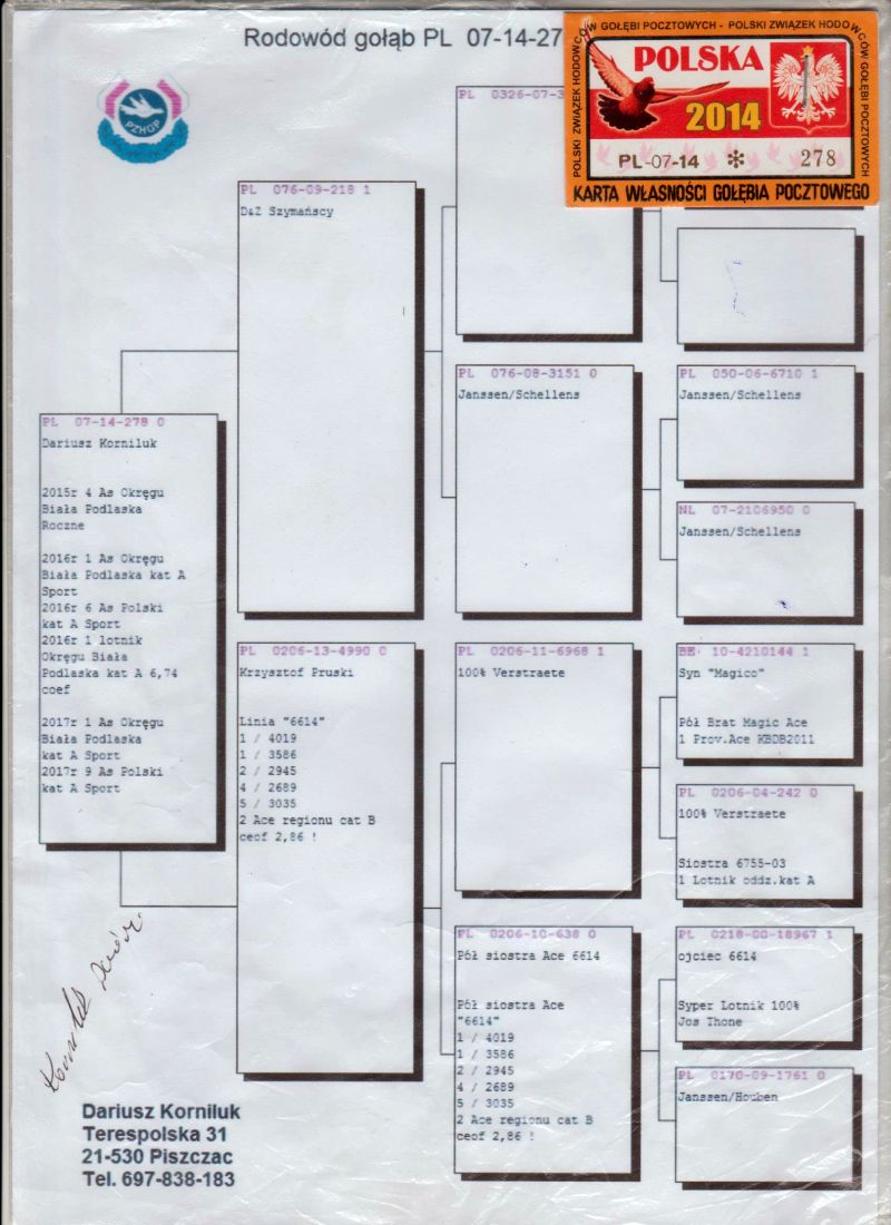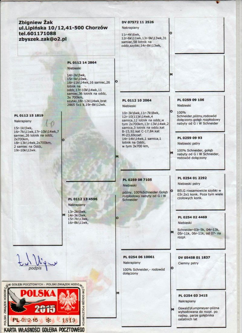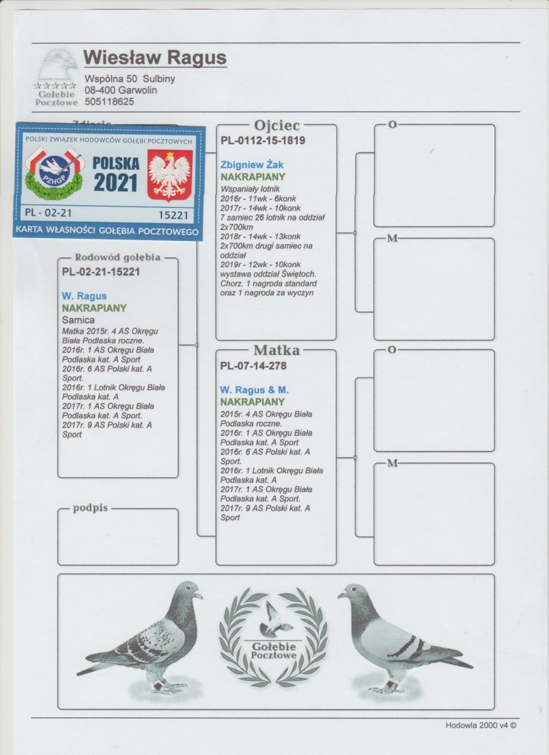 Oryginalny gołąb z hodowli Wiesława Ragusa. Jest to córka dwóch wybitnych lotników. Jej matka w 2016 roku była 6 lotnikiem Polski kat. A i 1 lotnikiem Okręgu. Rok później znów była 1 lotnikiem Okręgu i 9 lotnikiem Polski. Ojciec pochodzi z hodowli Zbigniewa Żaka. Między innymi w 2018 roku zdobył 13 konkursów. Znakomity lotnik maratoński. Odbiór osobisty w Opolu lub transport do uzgodnienia kurierem. Numer telefonu: 600 692 463