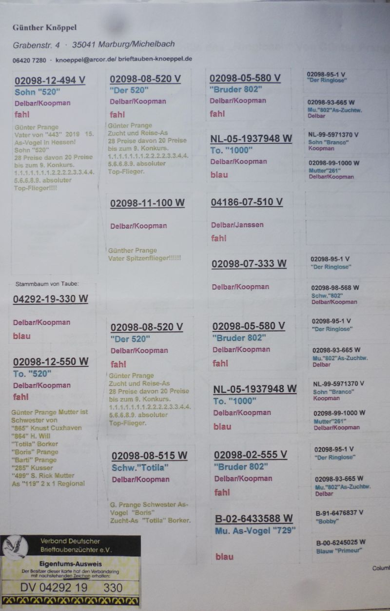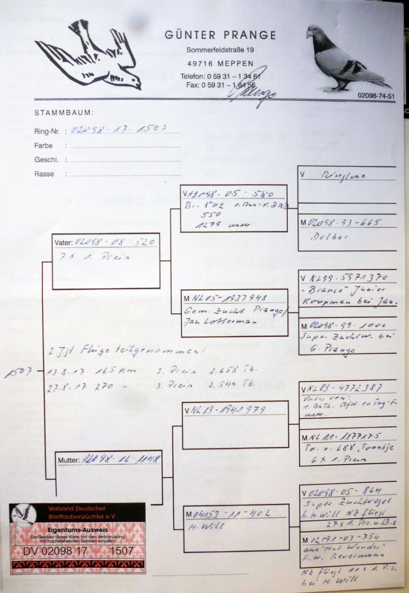 Oryginalny gołąb z hodowli Tadeusza Raburskiego. Jest to wnuczka słynnego gołębia Guntera Prange - "520". Ojciec tej samiczki również był lotowany u Guntera Prange i jako młody był super lotnikiem. Zdobył m.in.: 2/ 2658 i 3/ 2544. Odbiór osobisty w Opolu lub transport do uzgodnienia kurierem. Numer telefonu: 600 692 463
