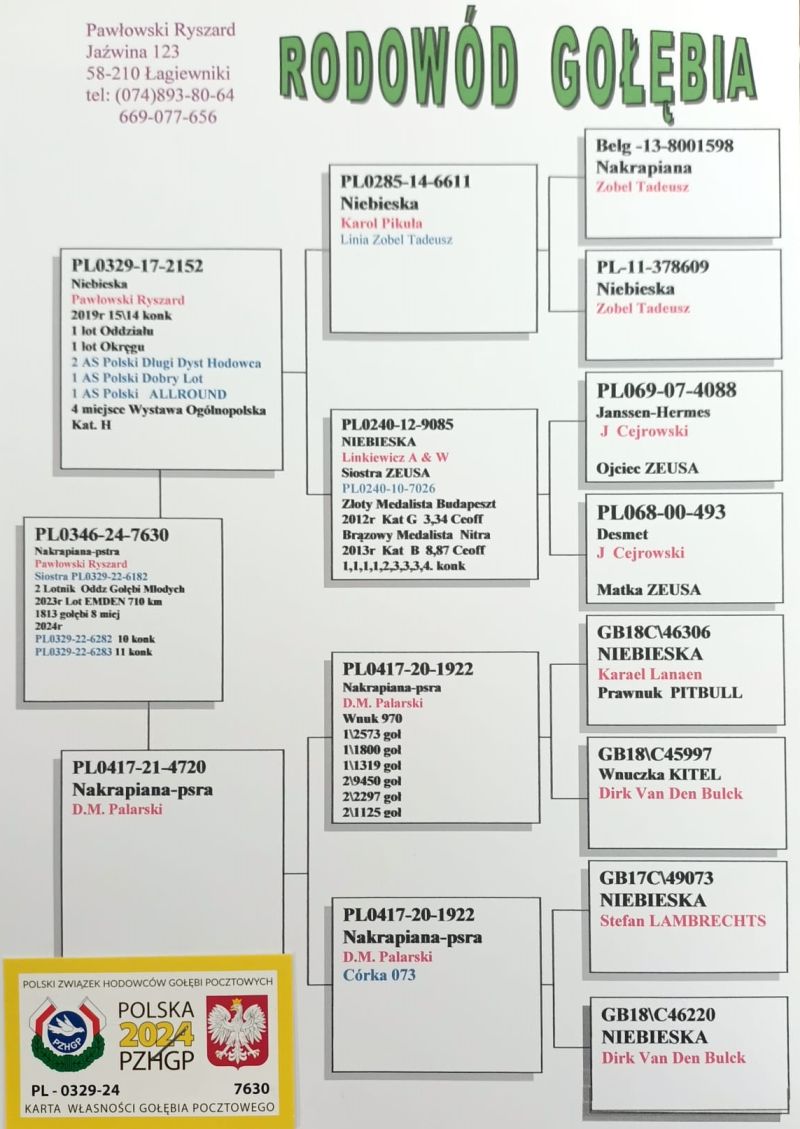 Oryginalny gołąb z hodowli Ryszarda Pawłowskiego. Jest to córka "2152" - 1 Asa Polski, najlepszego lotnika okręgu Wałbrzych i oddziału Dzierżoniów. Odbiór osobisty w Opolu lub transport do uzgodnienia kurierem. Numer telefonu: 600 692 463