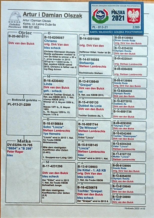 Oryginalny gołąb z hodowli Artur i Damian Olszak. Szczegóły pochodzenia w rodowodzie. Więcej informacji pod nr tel.: 880 108 765 **Transport kurierem koszt około 160zl po wylicytowaniu gołebia wplata na konto. Licytowane gołębie zlokalizowane na południu POLSKI
