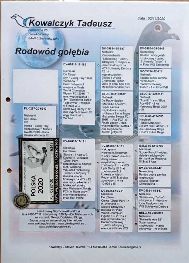 Oryginalny gołąb z hodowli Tadeusza Kowalczyka. Szczegóły pochodzenia w rodowodzie. Więcej informacji pod nr tel.: 880 108 765 **Transport kurierem koszt około 160zl po wylicytowaniu gołebia wplata na konto. Licytowane gołębie zlokalizowane na południu POLSKI
