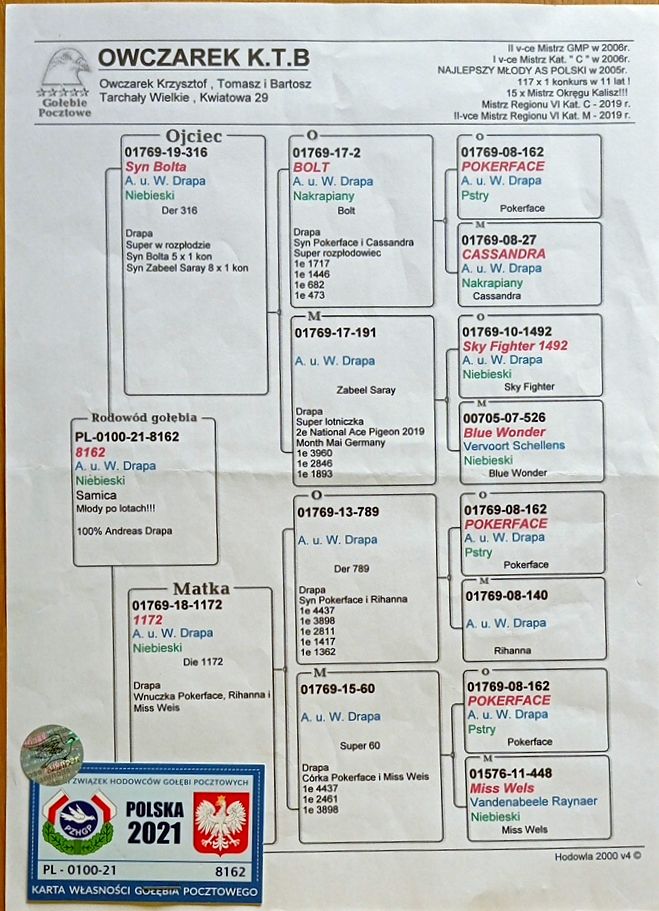 Oryginalny gołąb z hodowli KTB Owczarek. Szczegóły pochodzenia w rodowodzie. Więcej informacji pod nr tel.: 880 108 765 **Transport kurierem koszt około 160zl po wylicytowaniu gołebia wplata na konto. Licytowane gołębie zlokalizowane na południu POLSKI
