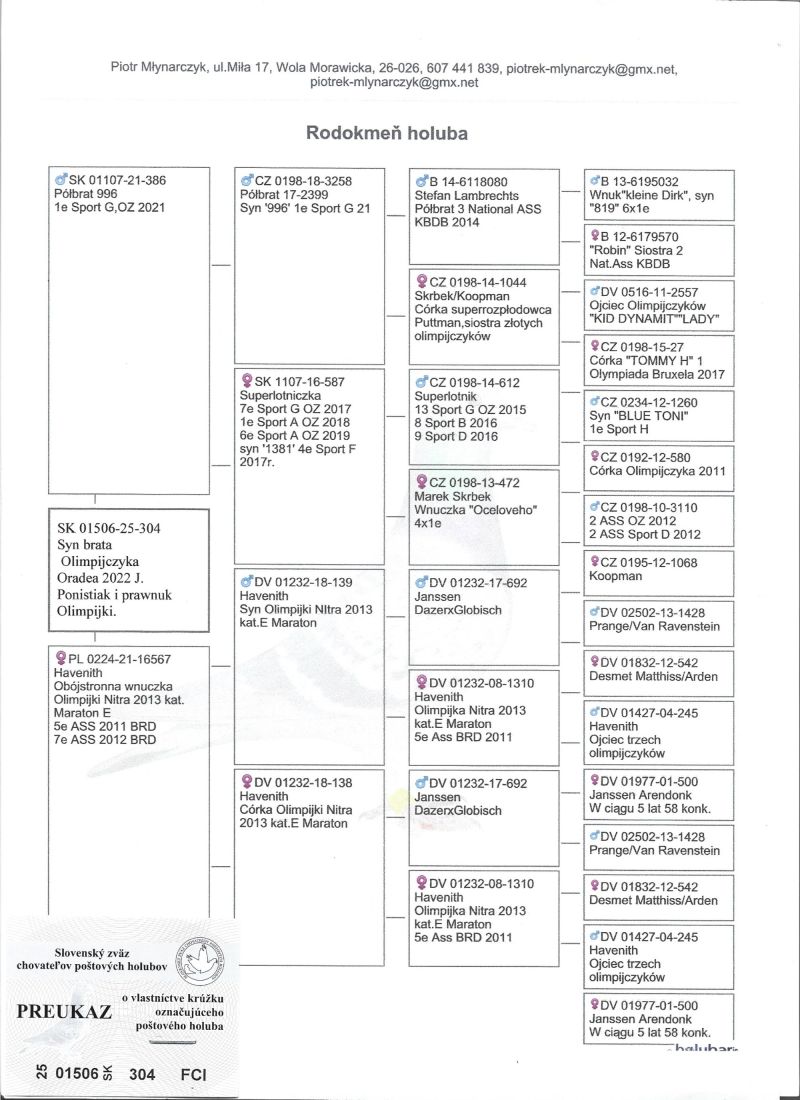 Havenith, gołąb dalekodystansowy. Prawnuk (wnuczka) Olimpijki Nitra 2013 DV 01232-08-1310 x półbrat "996" 1e Sport 2021 oryginał Jakub Poniśtak.Rodzina Seidel posiada siedmiu Olimpijczyków w kategorii daleki dystans, m.in. DV 01232-15-306 Olimpijka z Oradea 2022, pierwszy gołąb niemiec i 17 świata. Gołąbki zaszczepione msv i odrobaczone. Transport gołębi kurierem po uzgodnieniu,odbiór osobisty
