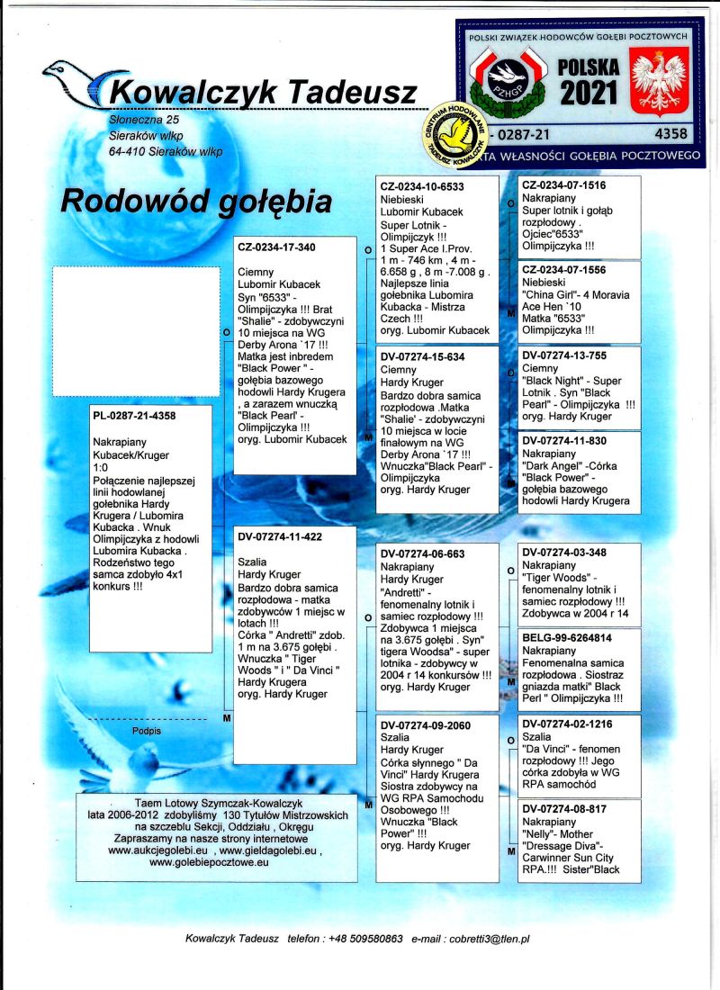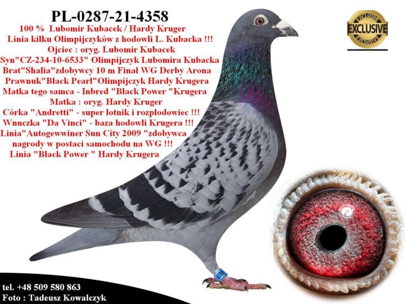PL-0287-21-4358 Potomek najlepszych gołębi z hodowli Hardy Krugera