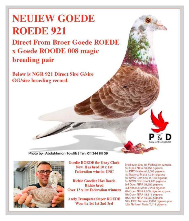 AUKCJA PROMOCYJNA ROCZNIKA 2025 (Cena obowiązuje wyłącznie na tej aukcji) Profesjonalna hodowla z wieloletnim doświadczeniem, posiadająca w swoim stadzie materiał najwyższej światowej klasy, wywodzący się od takich hodowców jak: Jan Hooymans, Gerard Koopman, Mike Ganus, Tjeerd & Jouke Elzinga, Gino Clicque, Jos Vercammen, Jelle Roziers, Bart Geerinckx, Batenburg – v/d Merwe, Altmiks – Pigeons, Jo & Florian Hendriks, Kornelis Winner Loft – linia „Romario”, W & F Ebben, Bert Braspenning, Dirk van den Bulck, Peter v/d Merwe, Jan van de Pasch, Van Elsacker-Jepsen, Roger Desmet – Matthijs, Arie Dijkstra, Leo Heremans, Pieter Veenstra, Gaby Vandenabeele, Karl-Heinz Wichert, Hardy Kruger, Helmut & Alfons Klaas, Gebr. Janssen. Najwyższej klasy materiał hodowlany – najlepsze linie danych Hodowców. Wszystkie wylicytowane gołębie będą dostarczane firmą kurierską.