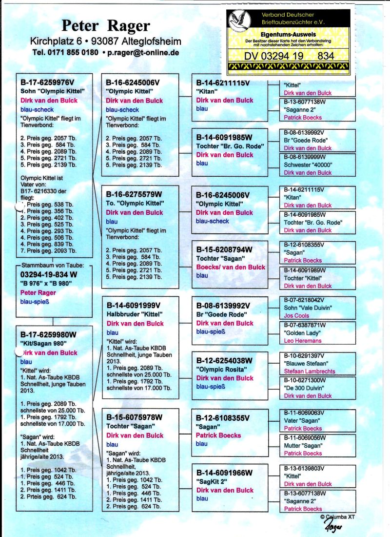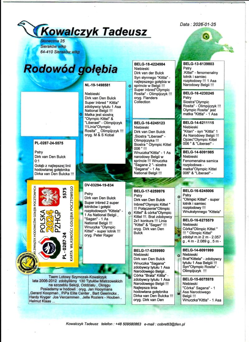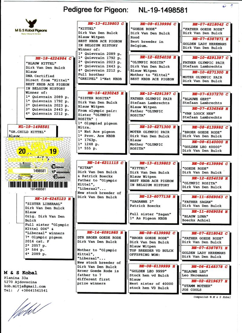 AUKCJA PROMOCYJNA (Cena obowiązuje wyłącznie na tej aukcji) Profesjonalna hodowla z wieloletnim doświadczeniem, posiadająca w swoim stadzie materiał najwyższej światowej klasy, wywodzący się od takich hodowców jak: Jan Hooymans, Gerard Koopman, Mike Ganus, Tjeerd & Jouke Elzinga, Gino Clicque, Jos Vercammen, Jelle Roziers, Bart Geerinckx, Batenburg – v/d Merwe, Altmiks – Pigeons, Jo & Florian Hendriks, Kornelis Winner Loft – linia „Romario”, W & F Ebben, Bert Braspenning, Dirk van den Bulck, Peter v/d Merwe, Jan van de Pasch, Van Elsacker-Jepsen, Roger Desmet – Matthijs, Arie Dijkstra, Leo Heremans, Pieter Veenstra, Gaby Vandenabeele, Karl-Heinz Wichert, Hardy Kruger, Helmut & Alfons Klaas, Gebr. Janssen. Najwyższej klasy materiał hodowlany – najlepsze linie danych Hodowców. Wszystkie wylicytowane gołębie będą dostarczane firmą kurierską.