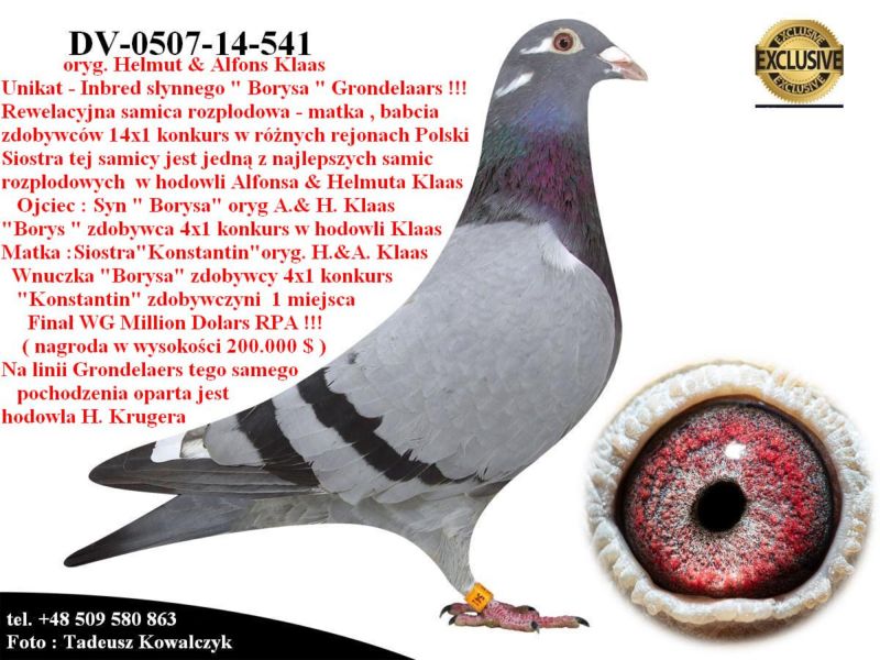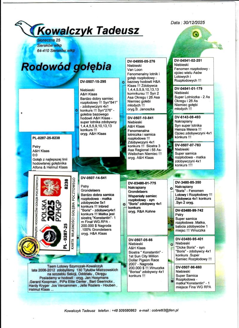 PL-0287-25-8238 Unikat - Potomek najlepszych gołębi z hodowli A.& H. Klaas