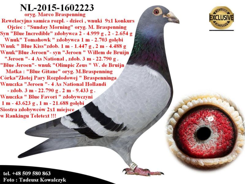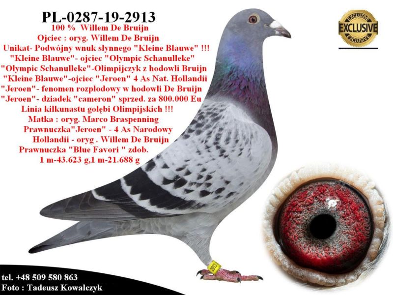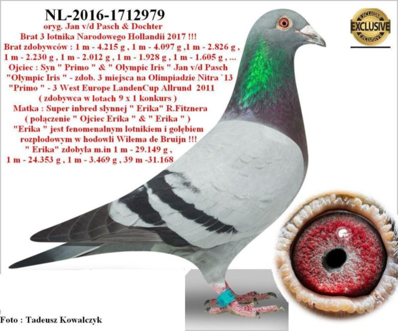AUKCJA PROMOCYJNA ROCZNIKA 2025 (Cena obowiązuje wyłącznie na tej aukcji) Profesjonalna hodowla z wieloletnim doświadczeniem, posiadająca w swoim stadzie materiał najwyższej światowej klasy, wywodzący się od takich hodowców jak: Jan Hooymans, Gerard Koopman, Mike Ganus, Tjeerd & Jouke Elzinga, Gino Clicque, Jos Vercammen, Jelle Roziers, Bart Geerinckx, Batenburg – v/d Merwe, Altmiks – Pigeons, Jo & Florian Hendriks, Kornelis Winner Loft – linia „Romario”, W & F Ebben, Bert Braspenning, Dirk van den Bulck, Peter v/d Merwe, Jan van de Pasch, Van Elsacker-Jepsen, Roger Desmet – Matthijs, Arie Dijkstra, Leo Heremans, Pieter Veenstra, Gaby Vandenabeele, Karl-Heinz Wichert, Hardy Kruger, Helmut & Alfons Klaas, Gebr. Janssen. Najwyższej klasy materiał hodowlany – najlepsze linie danych Hodowców. Wszystkie wylicytowane gołębie będą dostarczane firmą kurierską.
