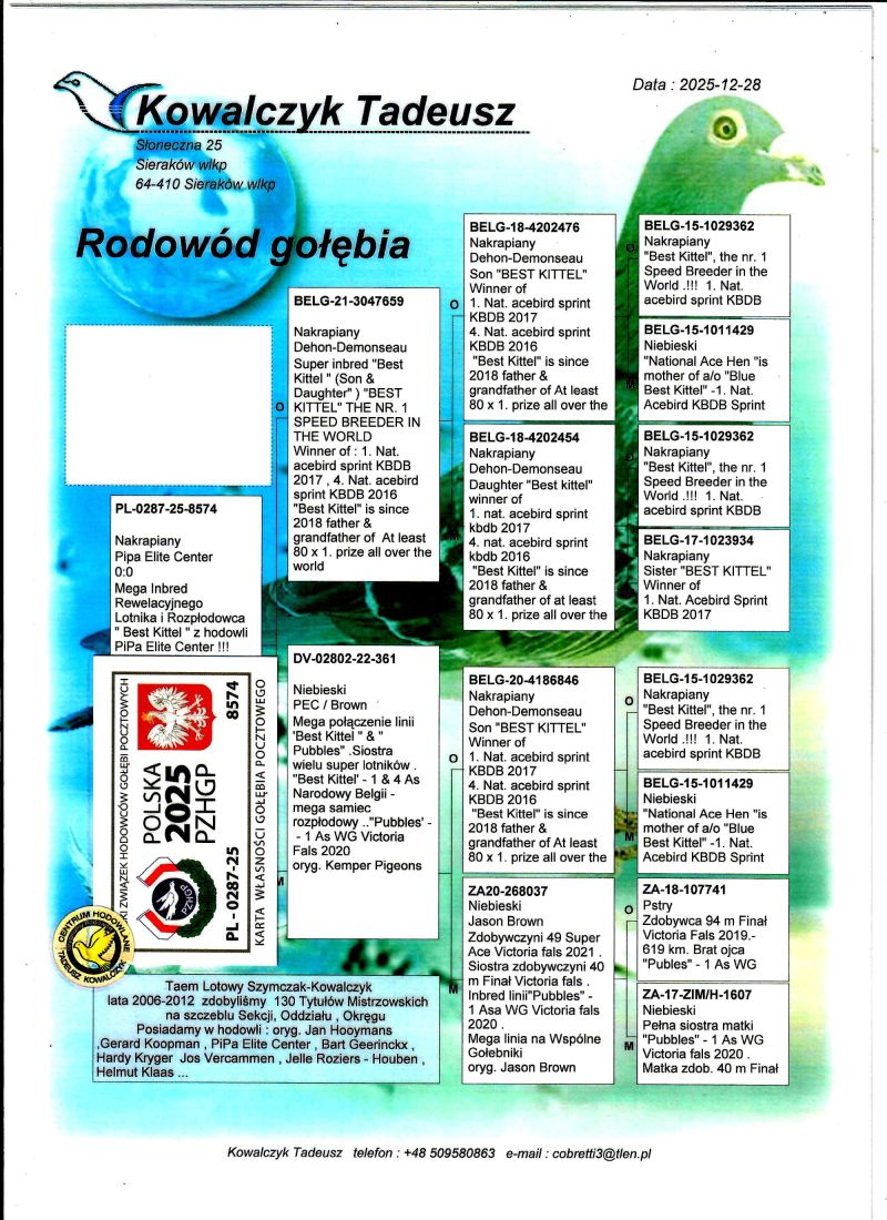 AUKCJA PROMOCYJNA ROCZNIKA 2025 (Cena obowiązuje wyłącznie na tej aukcji) Profesjonalna hodowla z wieloletnim doświadczeniem, posiadająca w swoim stadzie materiał najwyższej światowej klasy, wywodzący się od takich hodowców jak: Jan Hooymans, Gerard Koopman, Mike Ganus, Tjeerd & Jouke Elzinga, Gino Clicque, Jos Vercammen, Jelle Roziers, Bart Geerinckx, Batenburg – v/d Merwe, Altmiks – Pigeons, Jo & Florian Hendriks, Kornelis Winner Loft – linia „Romario”, W & F Ebben, Bert Braspenning, Dirk van den Bulck, Peter v/d Merwe, Jan van de Pasch, Van Elsacker-Jepsen, Roger Desmet – Matthijs, Arie Dijkstra, Leo Heremans, Pieter Veenstra, Gaby Vandenabeele, Karl-Heinz Wichert, Hardy Kruger, Helmut & Alfons Klaas, Gebr. Janssen. Najwyższej klasy materiał hodowlany – najlepsze linie danych Hodowców. Wszystkie wylicytowane gołębie będą dostarczane firmą kurierską.