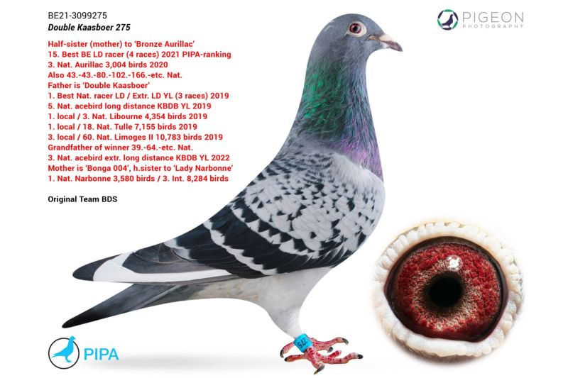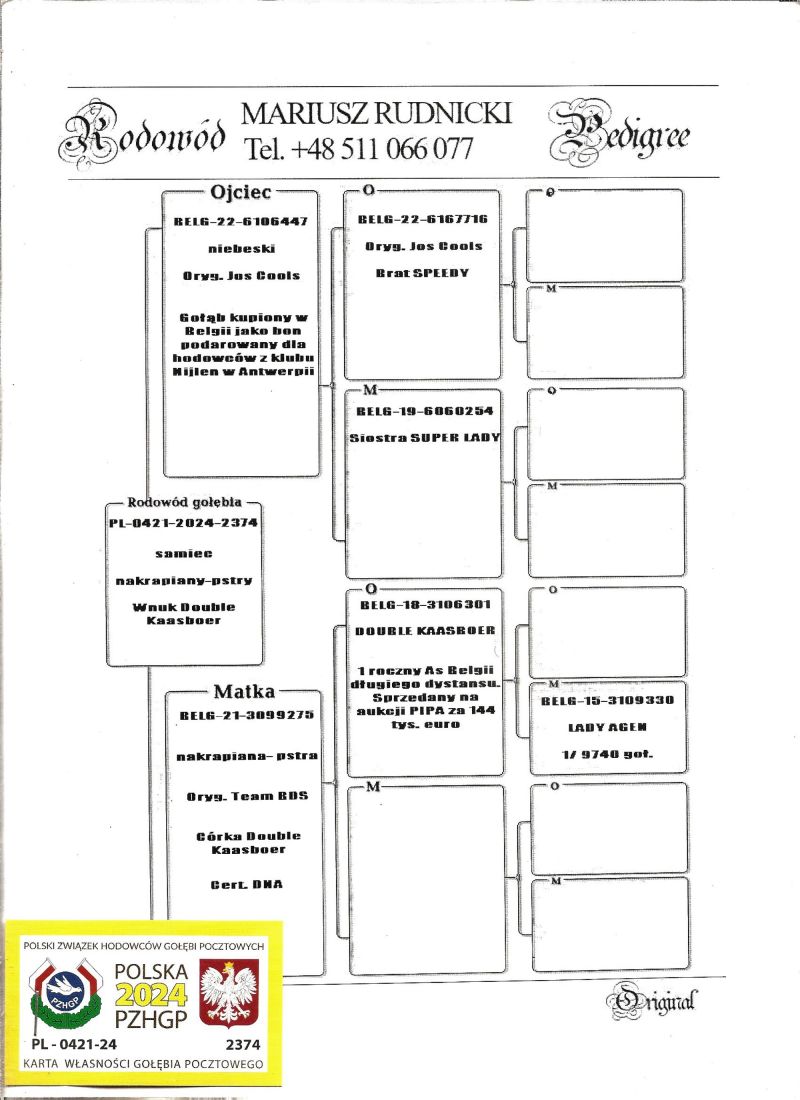Matka córka DOUBLE KAASBOER- najlepszego roczniaka Belgii w lotach dalekich. DOUBLE KAASBOER sprzedany na PIPA za 144 tys. euro. Ojciec oryginał Belg kupiony od Josa Coolsa. Szczegóły pochodzenia w rodowodzie i pod nr tel. 696 241 555
