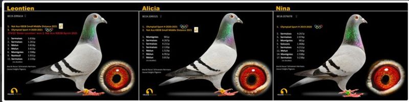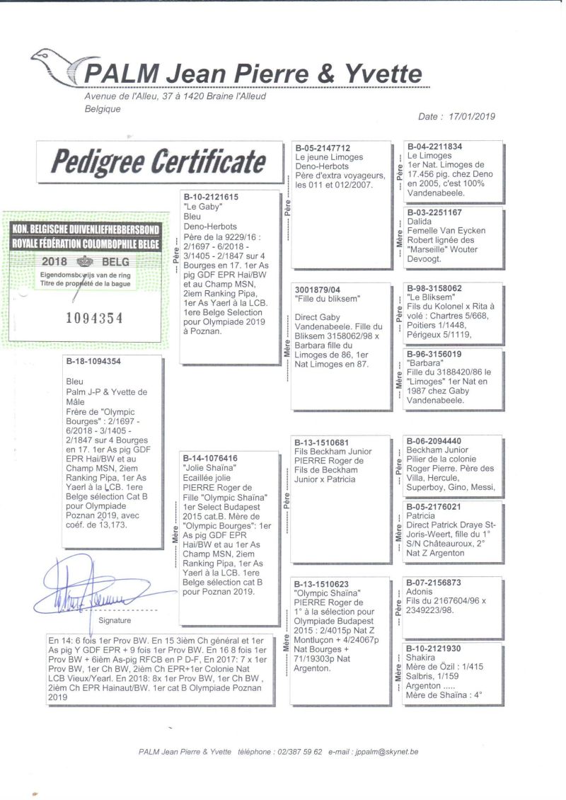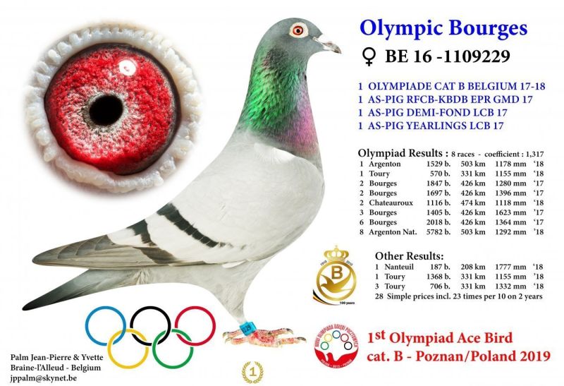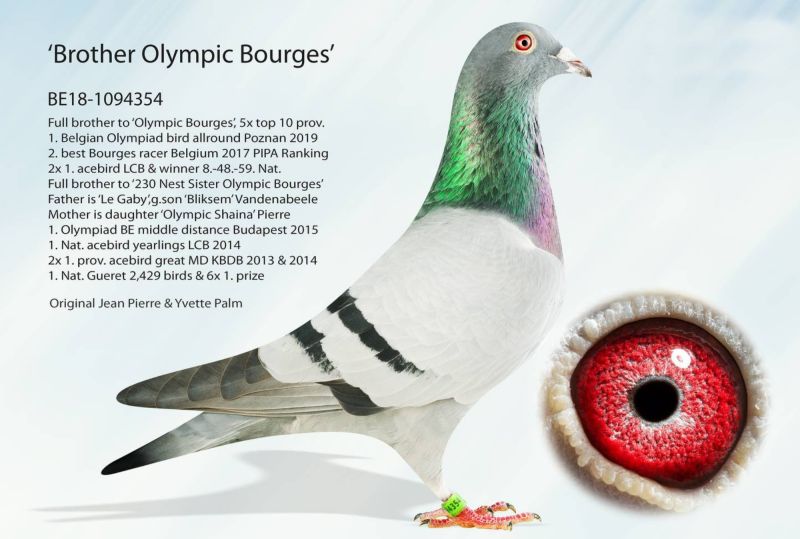 Ojciec, pełny brat 1 gołębia Belgii OLYMPIC BOURGES wnuk Bliksema Gaby Vandenabeele, a matka lotowana z u mistrza Belgii Eddy Schroevena. Szczegóły pochodzenia w rodowodzie i pod nr tel. 696 241 555