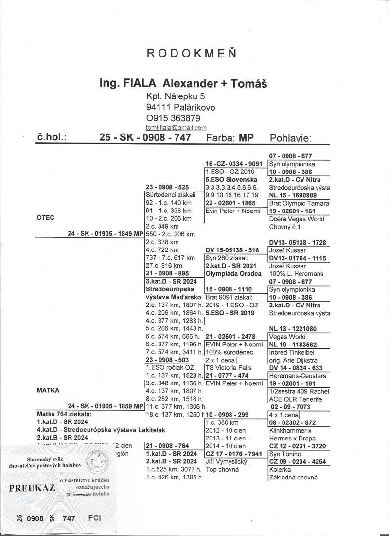 Oryginalny gołąb z hodowli długorocznych mistrzów Słowacji we wszystkich kategoriach.Możliwość sprawdzenia wyników na poniżej podanym linku. Výsledký 2025 1.miesto Majstri OZ Šurany staré a mladé holuby 1.miesto Majstri Nitrianskeho regiónu - Nitra, Bratislava, Komárno, Šurany. 1.miesto MAJSTROVSTVO SLOVENSKA KRÁTKE a STREDNÉ TRATE 2. miesto INTERMAJSTRVO SLOVENSKA 9.miesto MAJSTROVSTVO SLOVENSKA ROČNÉ HOLUBY 18.miesto MAJSTROVSTVO SLOVENSKA DLHÉ A SUPER DLHÉ TRATE Výsledky 2024 1.miesto Majstri OZ Šurany staré a mladé holuby 1.miesto Majstri Nitrianskeho regiónu - Nitra, Bratislava, Komárno, Šurany. 2. miesto INTERMAJSTRVO SLOVENSKA 2.miesto Retro majstrovstvo SLOVENSKA 3.miesto MAJSTROVSTVO SLOVENSKA KRÁTKE a STREDNÉ TRATE 3.miesto MAJSTROVSTVO SLOVENSKA DLHÉ A SUPER DLHÉ TRATE kat.D SR - 1, 3 miesto kat.I SR - 2. miesto kat.C SR - 4 miesto kat.B SR - 5 miesto 1. World Best Pigeon Dlhé trate SR 1. World Best Pigeon All Round SR Výsledky 2023 1. miesto Majstri OZ Šurany - staré holuby 2. miesto OZ Šurany - mladé holuby 4. miesto MAJSTROVSTVO SLOVENSKA STREDNÉ TRATE 4. miesto INTERMAJSTROVSTVO SR 6. miesto MAJSTROVSTVO SLOVENSKA DLHÉ A SUPER DLHÉ TRATE Výsledky 2022 2. miesto MAJSTROVSTVO SLOVENSKA STREDNÉ TRATE 9. miesto INETMAJSTROVSTVO SR 12. miesto MS ROČNÉ HOLUBY 6. miesto MDKS 1. miesto Majstri OZ Šurany staré a mladé holuby Výsledky 2021 3. miesto MAJSTROVSTVO SLOVENSKA KRÁTKE A STREDNÉ TRATE 5. miesto INTERMAJSTROVSTVO SR 10. miesto MS DLHÉ TRATE 18. miesto MS ROČNÉ HOLUBY 22. miesto MS SUPER DLHÉ TRATE Kat. B – 9.11. miesto SR Kat. D – 2.8. miesto SR Kat. E – 13. miesto SR 1. miesto Majstri OZ Šurany Výsledky 2020: 1. miesto MAJSTRI SLOVENSKA KRÁTKE A STREDNÉ TRATE 2. miesto INTERMAJSTROVSTO SR 11. miesto MS – ročné holuby 1. miesto – Majstri OZ Šurany Výsledky 2019: 1. miesto MAJSTRI SLOVENSKA KRÁTKE A STREDNÉ TRATE 4.miesto MS DLHÉ TRATE 2.kat.B - SR 3.kat.B - SR 5.7.kat.ESO - SR 1. miesto - Majstri OZ Šurany Výsledky 2018: 2.miesto - MS DLHÉ TRATE 4.miesto - MS KRÁTKE a STREDNÉ TRATE 6.miesto - SUPER DLHÉ TRATE 3.miesto kat.H - SR - 15. miesto kat.H - Olympiáda Poznaň 1.Generálni majstri OZ Výsledky 2017: 3.miesto - MS SUPER DLHÉ TRATE 11.miesto - Intermajstrovstvo 7.kat.E - SR - 12 - 0908 - 884 1.Generálni majstri OZ Výsledky 2016: 1. MAJSTRI SLOVENSKA - STREDNÉ TRATE 3.miesto - MS SUPER DLHÉ TRATE 8.miesto - MS DLHÉ TRATE 8.miesto - MS KRÁTKE TRATE 3.miesto - INTERMAJSTROVSTVO 1.ESO Slovenska - 12 - 0908 - 799 koef. 14,279 - 4.kat.H - Olympiáda Brusel 3.kat.B - SR - 12 - VR98 - 405 - 29.kat.B - Olympiáda Brusel 4.kat.B - SR - 12 - 0908 - 485 7.ESO Slovenska - 12 - 0908 - 743 Letu Zdar 2016: 1.Generálni majstri Letu Zdar "A" team 2.Generálni majstri Letu Zdar "B" team 1.Generálna holubica - 12 - 0908 - 799 2.miesto - Dlhé trate - 12 - VR98 - 405 3.miesto - Stredné trate - 13 - 0908 - 566 Výsledky 2015: 1.Generálni majstri OZ Šurany - staré holuby Majstrovstvo Slovenska: 5.miesto - Dlhé trate 5.miesto - Stredné trate 11.miesto - Super dlhé trate 26.miesto - Krátke trate 8.ESO - SR 12.kat.C - SR Výsledky 2014: 1.Generálni majstri OZ Šurany - staré holuby. 1.Generálni majstri OZ Šurany - mladé holuby. Majstrovstvo Slovenska: 3.miesto - Super dlhé trate 8.miesto - Stredné trate 4.Generálni majstri časopisu Letu Zdar
