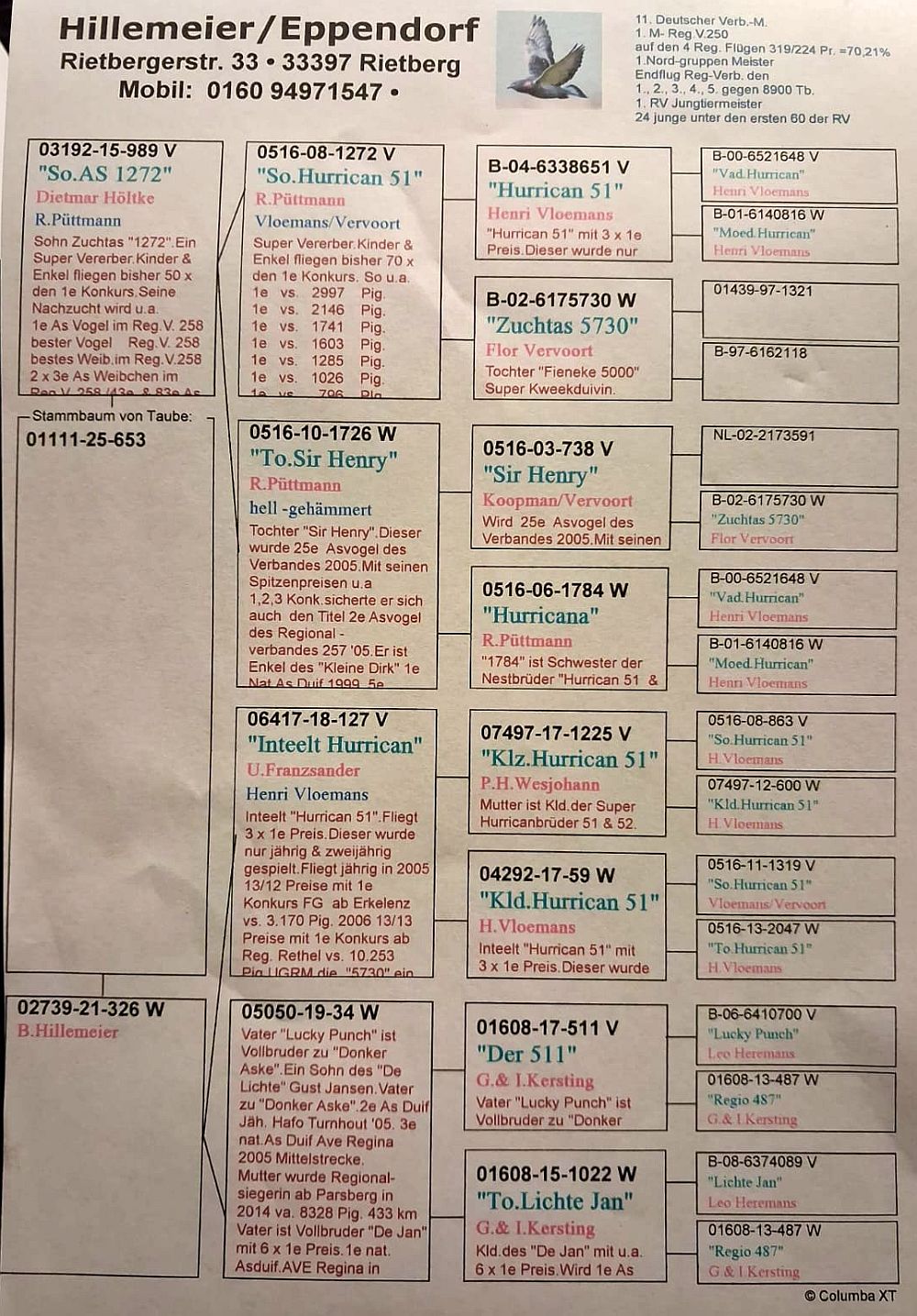 oryg. Bernhard Hillemeier (Vloemans/ Kersting), linia "Hurrican 51", "Sir Henry", "Der 511" Szczegóły pochodzenia w rodowodzie. Gołąb jest sprzedawany bezpośrednio od hodowcy i znajduje się w Polsce, można go obejrzeć w miejscowości Zblewo (woj. pomorskie), po wcześniejszym kontakcie telefonicznym. Więcej informacji o gołębiu i transporcie pod nr tel.: 511 607 710.