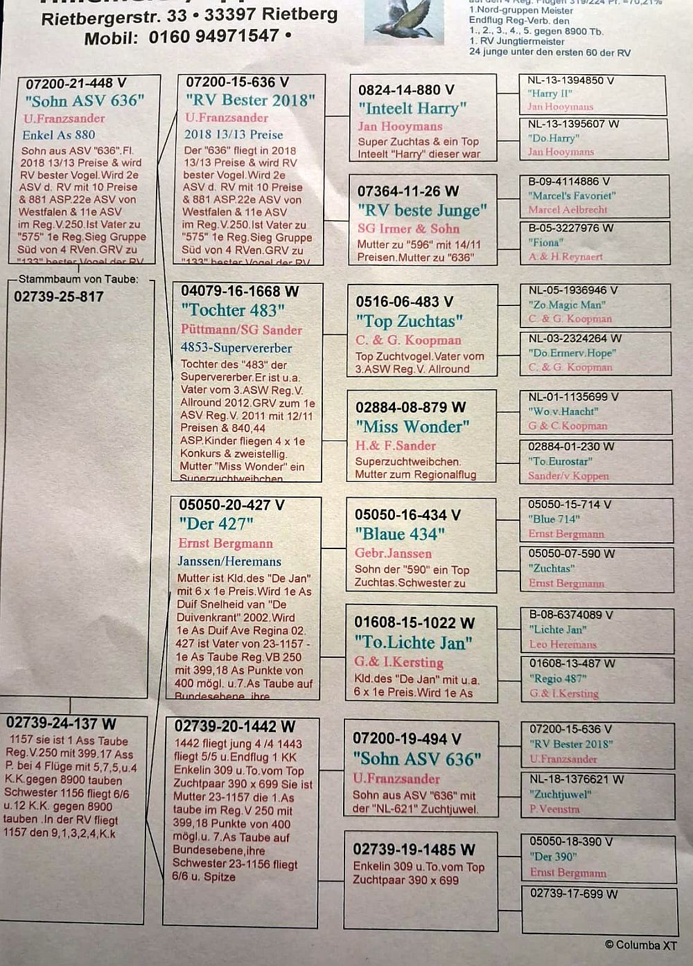 oryg. Bernhard Hillemeier (Hooymans/ Koopman), linia "As 636", "Harry", "Zuchtass" Szczegóły pochodzenia w rodowodzie. Gołąb jest sprzedawany bezpośrednio od hodowcy i znajduje się w Polsce, można go obejrzeć w miejscowości Zblewo (woj. pomorskie), po wcześniejszym kontakcie telefonicznym. Więcej informacji o gołębiu i transporcie pod nr tel.: 511 607 710.