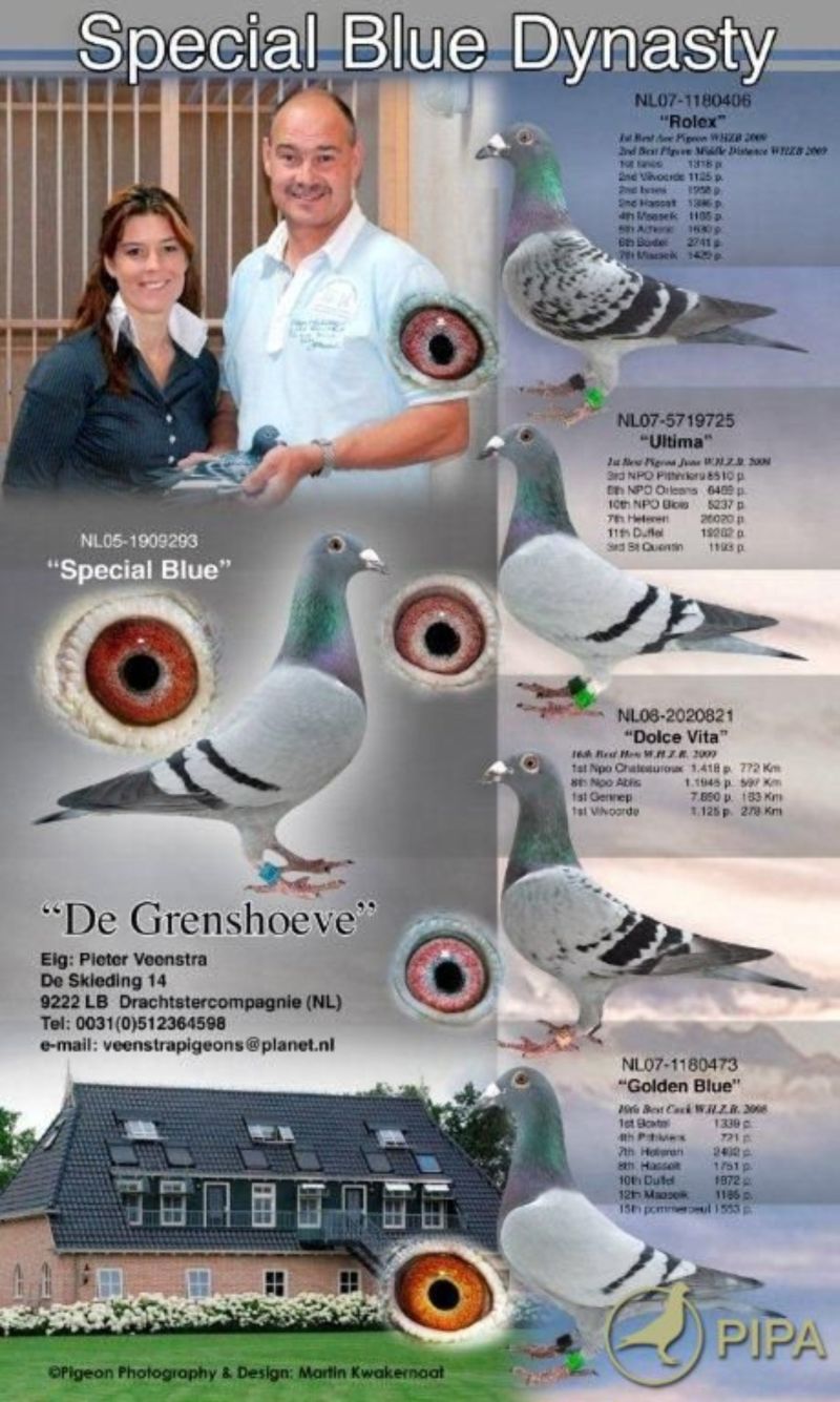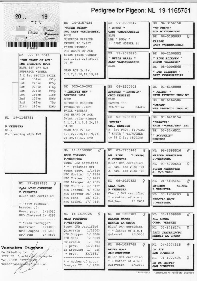 Samiec od Pietera Veenstry, wnuk MISS OVEREGGE, która w kilka tygodni zdobyła 3 x 1 konkurs na kilka tysiecy gołębi. Ojciec 5 x 1 konkurs. Szczegóły pochodzenia w rodowodzie i pod nr tel. 696 241 555