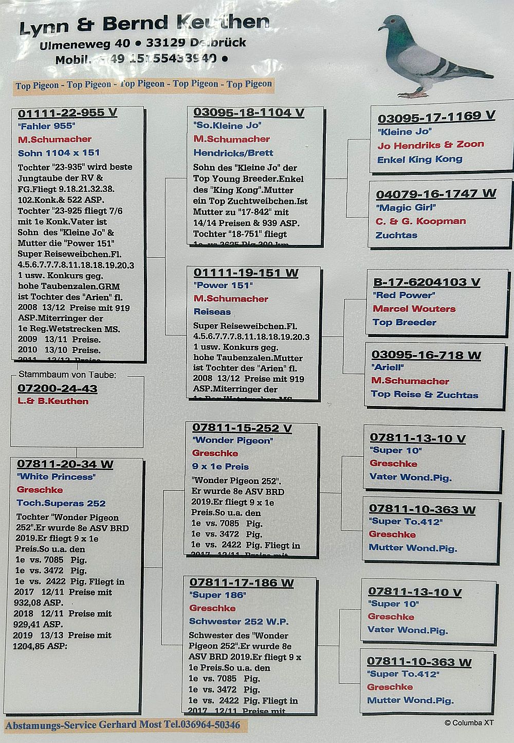 oryg. Lynn & Bernd Keuthen (Schumacher/ Greschke), linia "Kleine Jo", "Power 151", "Wonder Pigeon" Szczegóły pochodzenia w rodowodzie. Gołąb jest sprzedawany bezpośrednio od hodowcy i znajduje się obecnie w Niemczech. Można odebrać wylicytowanego gołębia podczas Olimpiady w Dortmundzie w dniach 7-8.02.2026 r. Więcej informacji o gołębiu i transporcie pod nr tel.: 511 607 710.