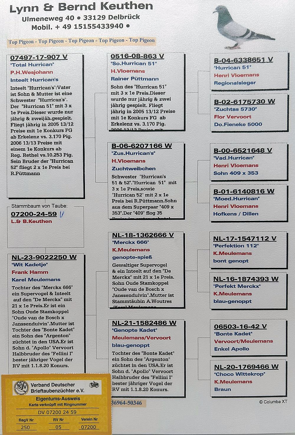 oryg. Lynn & Bernd Keuthen (Vloemans/ Meulemans), linia "Hurrican 51", "Merckx 666", "Kadett" Szczegóły pochodzenia w rodowodzie. Gołąb jest sprzedawany bezpośrednio od hodowcy i znajduje się obecnie w Niemczech. Można odebrać wylicytowanego gołębia podczas Olimpiady w Dortmundzie w dniach 7-8.02.2026 r. Więcej informacji o gołębiu i transporcie pod nr tel.: 511 607 710.