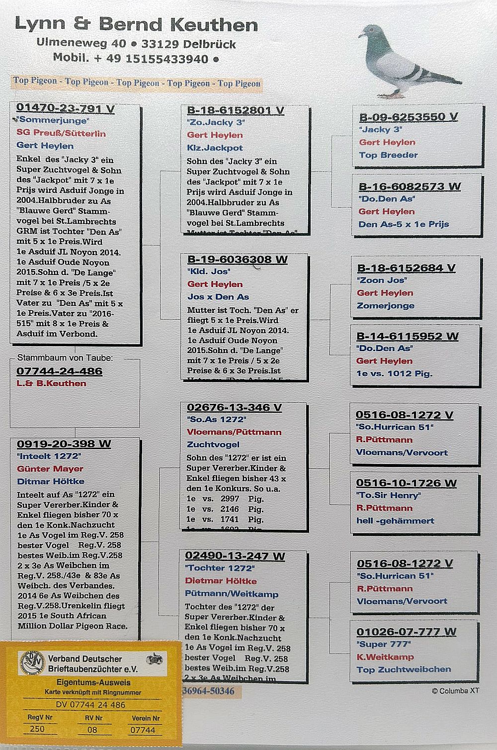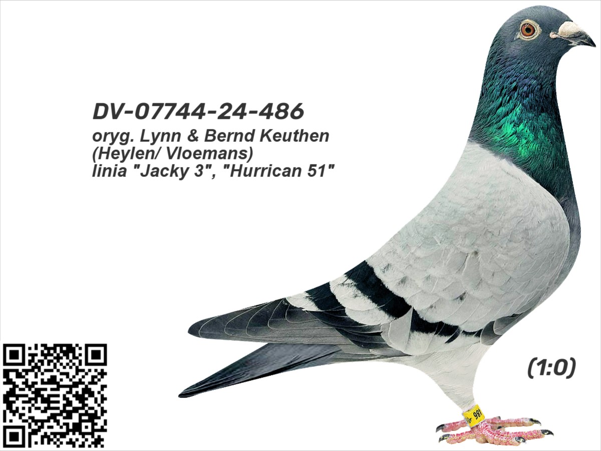 oryg. Lynn & Bernd Keuthen (Heylen/ Vloemans), linia "Jacky 3", "Hurrican 51" Szczegóły pochodzenia w rodowodzie. Gołąb jest sprzedawany bezpośrednio od hodowcy i znajduje się obecnie w Niemczech. Można odebrać wylicytowanego gołębia podczas Olimpiady w Dortmundzie w dniach 7-8.02.2026 r. Więcej informacji o gołębiu i transporcie pod nr tel.: 511 607 710.