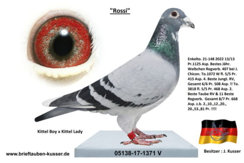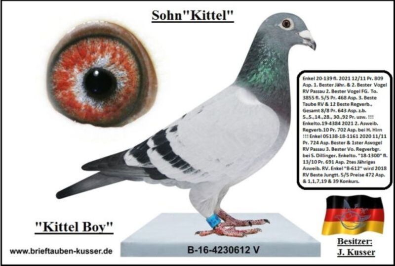 Oryginalny gołąb z hodowli kolegi Josef Kusser.Szczegóły pochodzenia w rodowodzie.Więcej informacji pod nr tel.: Josef Kusser +491714040903 Adrian +48692793463