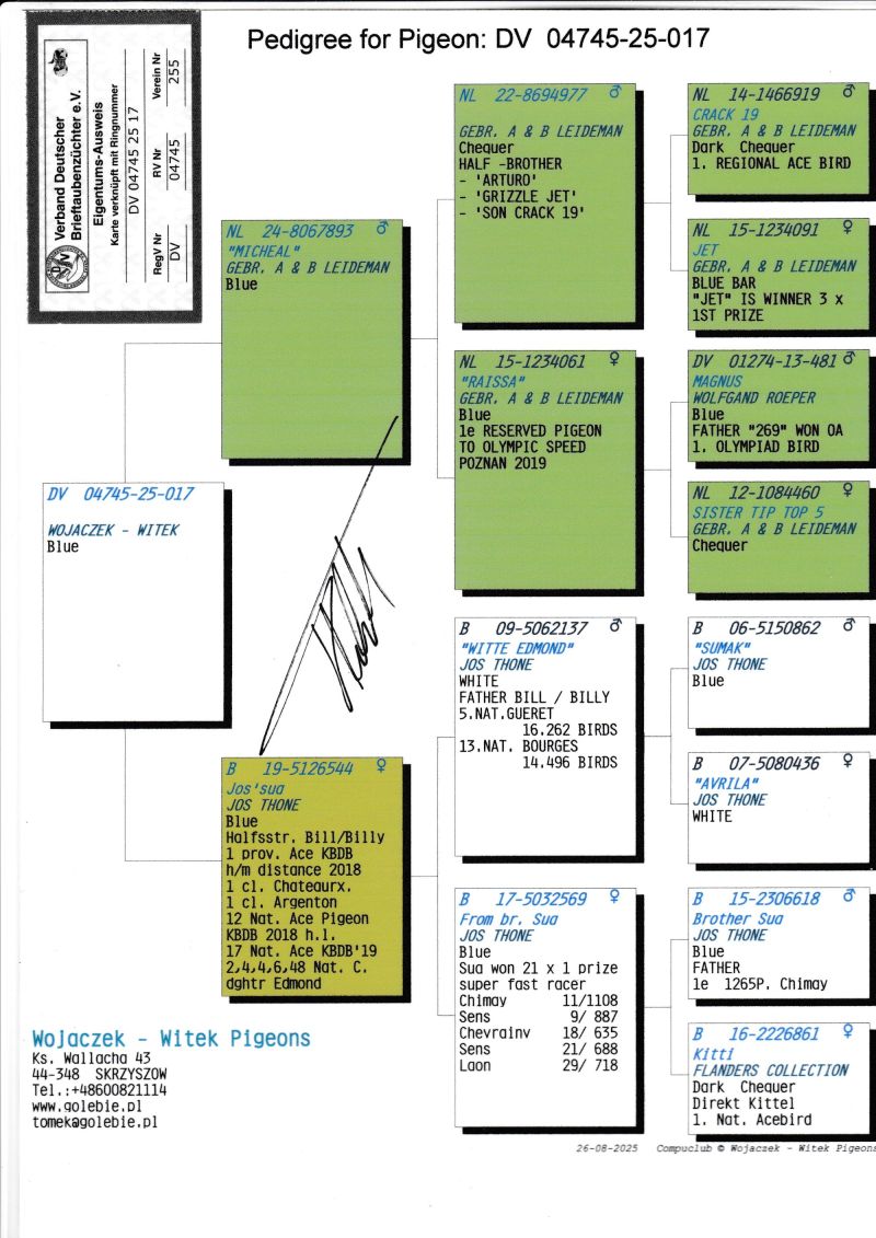 KOSZT TRANSPORTU 120 ZŁ (maksymalnie 3 gołębie w jednej paczce). KOSZTA ZA GOŁĘBIA I TRANSPORT KLIENCI BĘDĄ PŁACIĆ BEZPOŚREDNIO KIEROWCY KTÓRY PRZYWIEZIE GOŁĘBIE. Gołąb z hodowli WOJACZEK-WITEK. Szczegóły pochodzenia w rodowodzie. Kontakt w sprawie gołębi oraz transportu pod numerem telefonu +48 600 821 114