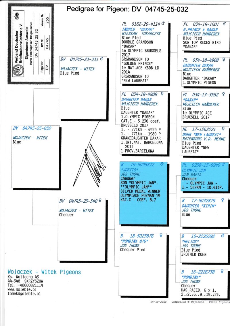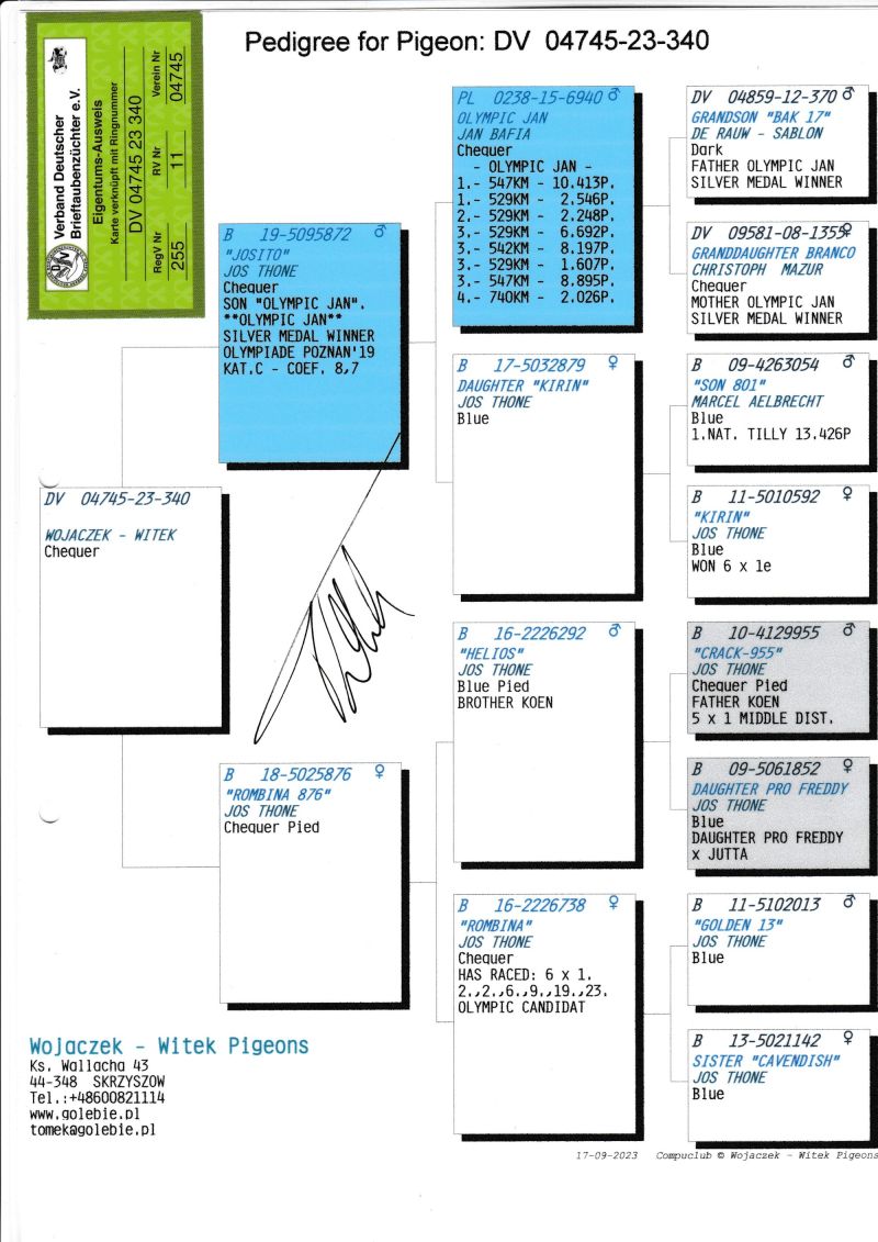 KOSZT TRANSPORTU 120 ZŁ (maksymalnie 3 gołębie w jednej paczce). KOSZTA ZA GOŁĘBIA I TRANSPORT KLIENCI BĘDĄ PŁACIĆ BEZPOŚREDNIO KIEROWCY KTÓRY PRZYWIEZIE GOŁĘBIE. Gołąb z hodowli WOJACZEK-WITEK. Szczegóły pochodzenia w rodowodzie. Kontakt w sprawie gołębi oraz transportu pod numerem telefonu +48 600 821 114